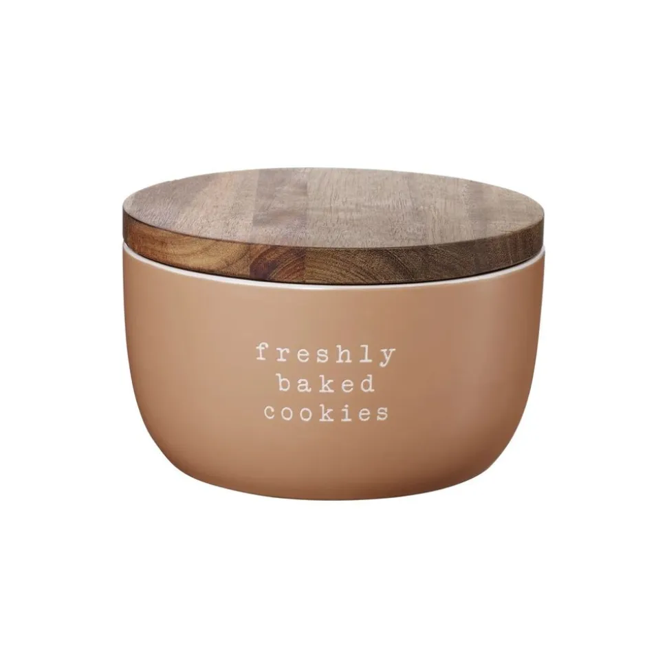 Voorraadpot met deksel gemaakt van acaciahout. De Hey! De collectie communiceert boodschappen in de vorm van gezandstraalde uitspraken die je in een goed humeur brengen. “versgebakken koekjes” geeft een idee van wat er onder het acaciahouten deksel verborgen kan zitten. De “Hey!” zijn geschikt als allrounder in twee maten. Blikken voor versgebakken koekjes, noten en andere lekkernijen.