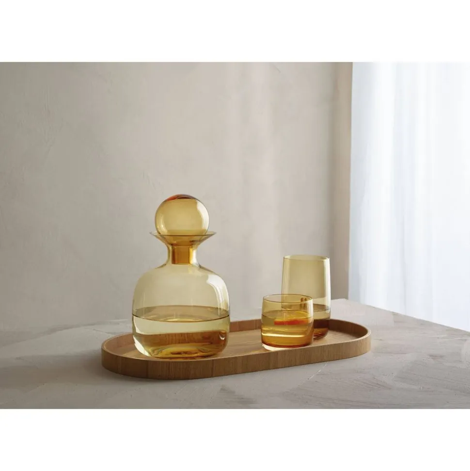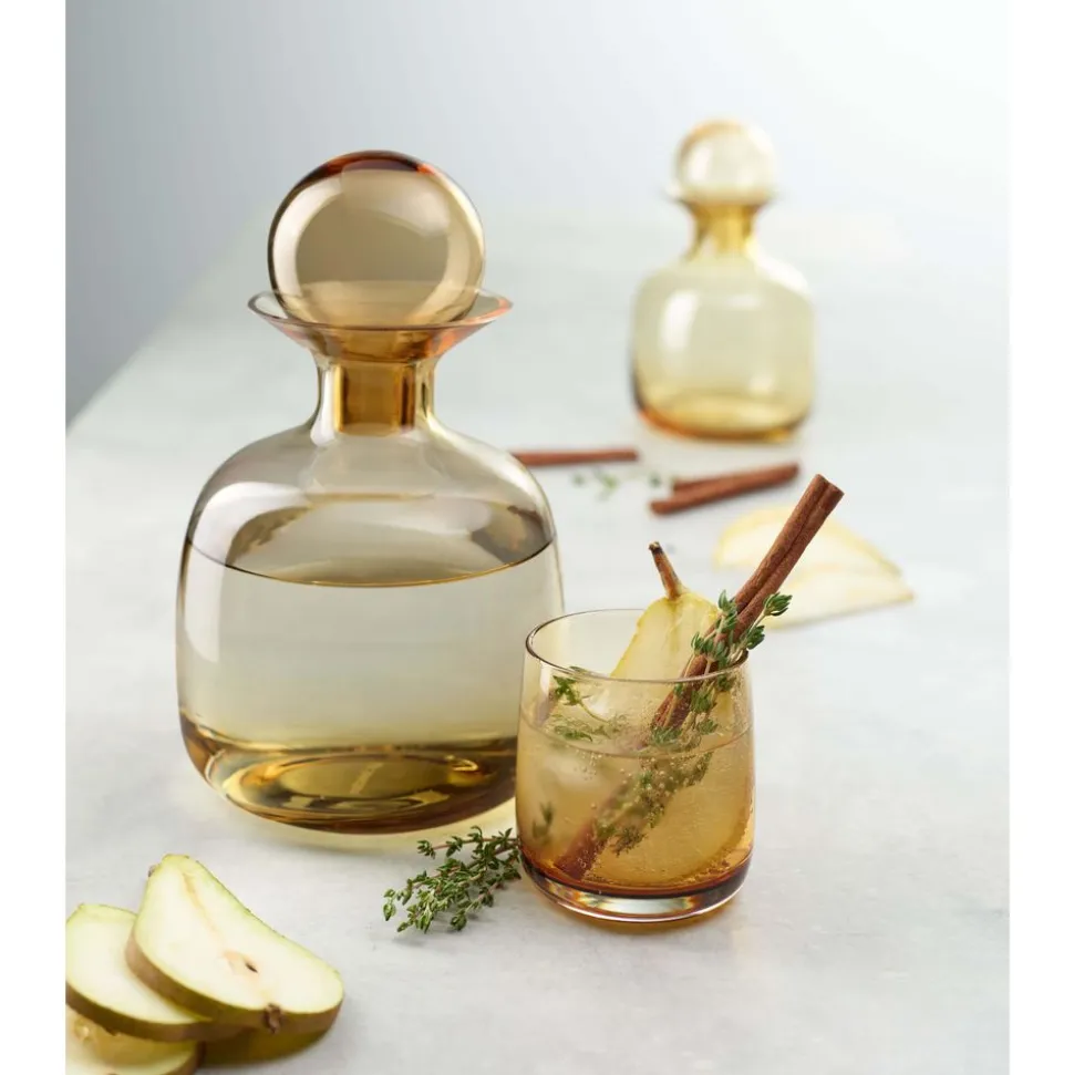 De mondgeblazen glascollectie van ASA Selection met design, genot en functie. Of het nu gaat om trendy longdrinks met gin of alcoholvrije versnaperingen zoals spritzers en limonades: het glas met een inhoud van 0,4 liter ligt, net als de kleinere tumbler, heerlijk in de hand dankzij de versterkte bodem en de licht bolvormige vorm. Net als deze glazen is de karaf, die verkrijgbaar is in twee maten geschikt voor consumptie, een zintuiglijk en design hoogtepunt in de thuisbar. Met slechts een vleugje kleur geven twee decors uit de glasserie elk hun eigen sterke persoonlijkheid: de amberkleurige glinsterende ‘Amber’-glazen symboliseren gezellige warmte. De karaffen worden aangeboden in een geschenkverpakking.
