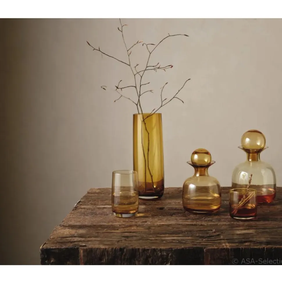 De mondgeblazen glascollectie van ASA Selection met design, plezier en functie. Of het nu gaat om trendy longdrinks met gin of alcoholvrije versnaperingen zoals spritzers en limonades: het glas met een inhoud van 0,4 liter ligt net als de kleinere tumbler heerlijk in de hand dankzij de versterkte bodem en licht bolvormige vorm. Net als deze glazen is de karaf, die verkrijgbaar is in twee plezierige maten, een zintuiglijk en design hoogtepunt in de huisbar. Met slechts een vleugje kleur hebben twee decors in de glasserie elk hun eigen sterke persoonlijkheid: de glinsterende amberkleurige “Amber” glazen symboliseren gezellige warmte. De karaffen worden aangeboden in een geschenkverpakking.