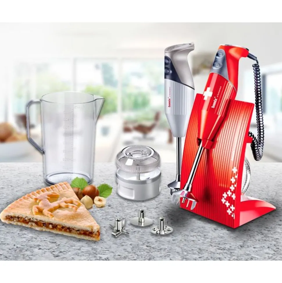 Staafmixer (200 W) met 2 snelheden: 12.000 toeren/minuut + 17.000 toeren/minuut. De set (met statief) bestaat uit: 3 hulpstukken (klopper + menger + multi), een kruik met handvat en een processormolen . Uitvoering in Swiss cross red