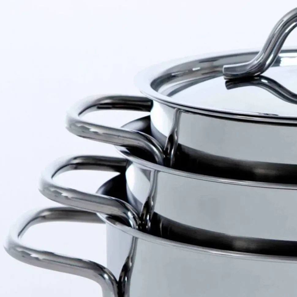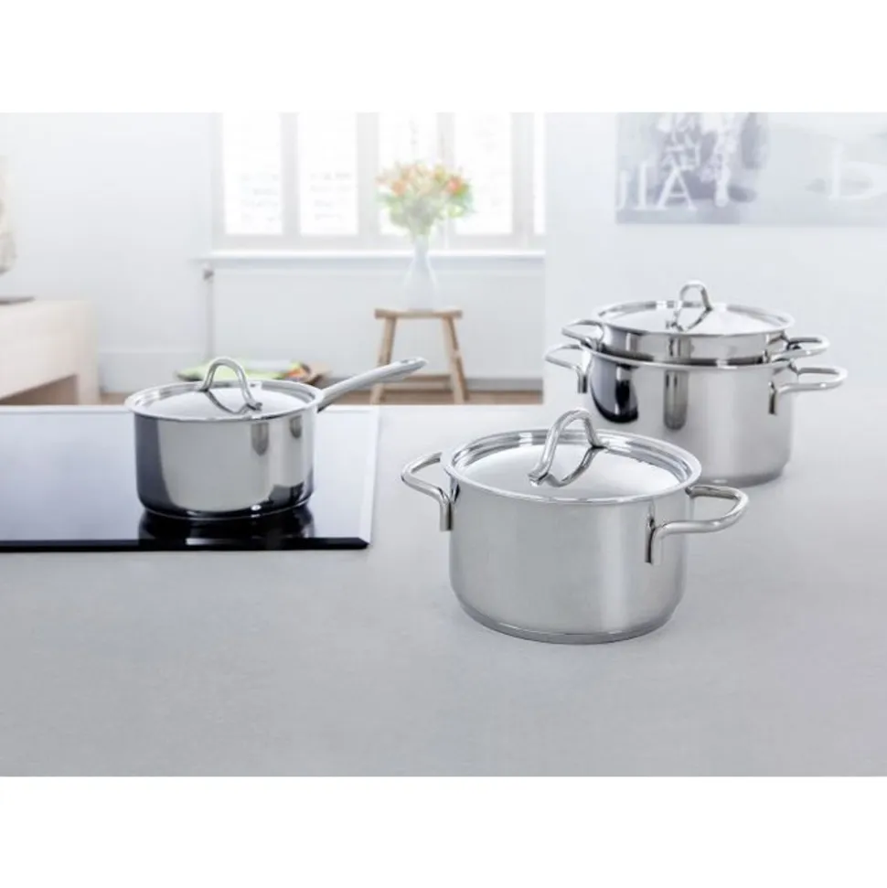 De BK Profiline is een pannenserie zonder opsmuk die ongecompliceerd gemak biedt op elk fornuis. De pannen hebben een body van hoogglans gepolijst roestvrij edelstaal met een handige schenkrand. De body en bodem lopen vloeiend en afgerond in elkaar over, wat zorgt voor moeiteloos omroeren en eenvoudige reiniging. De grepen en stelen liggen prettig in de hand en zorgen voor een veilige grip tijdens het kookproces. De deksels zijn hoogglans gepolijst en maken het geheel mooi af.