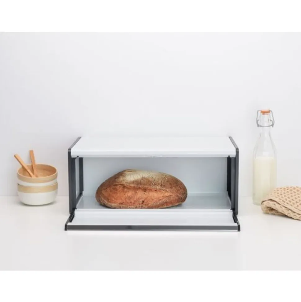 Op zoek naar een ruimtebesparende oplossing om je brood vers of je chips krokant te houden? Maak kennis met de Brabantia Broodtrommel met Klepdeksel. Er passen makkelijk twee broden in en door het rechthoekige ontwerp heeft hij zelf niet veel ruimte nodig. Door de platte bovenkant plaats je je voorraadbussen er handig bovenop. Het deksel heeft een grote greep voor makkelijk openen en een magneet waardoor het perfect sluit. Geen plaats op je aanrecht? Hang hem aan de muur met de ophangogen – een deksels handige broodtrommel!