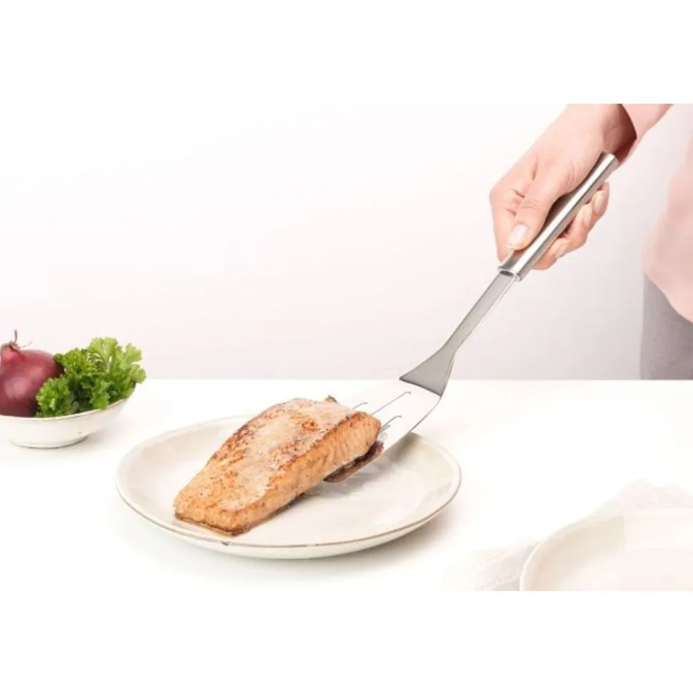 - Veerkrachtig roestvrij stalen bakspaan met sleuven – teveel aan braadvet kan gemakkelijk weg