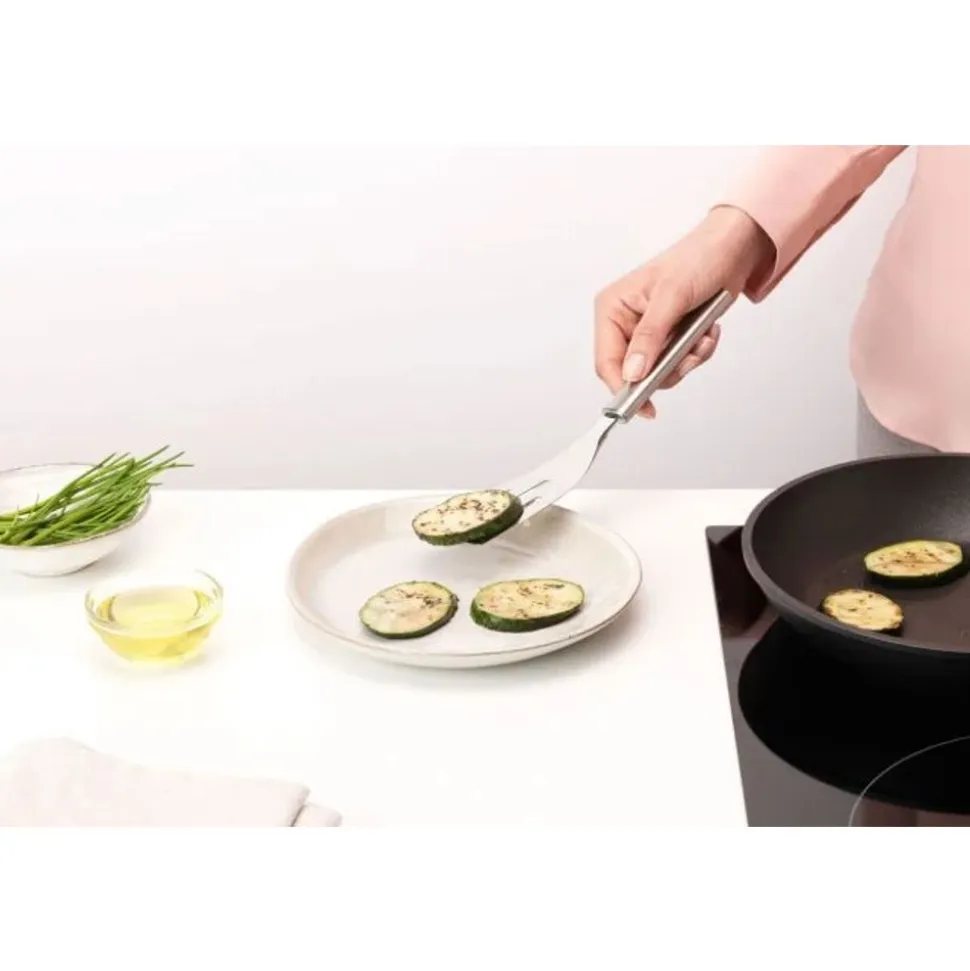 Eieren, vlees, pannenkoeken… Draai ze om en serveer ze met deze Brabantia Profile spatel. Deze kleine spatel in mat roestvrij staal heeft sleuven, waardoor het vet er makkelijk af loopt. En hij heeft geen naden, dus zo schoon en hygiĆ«nisch. Een super spatel!