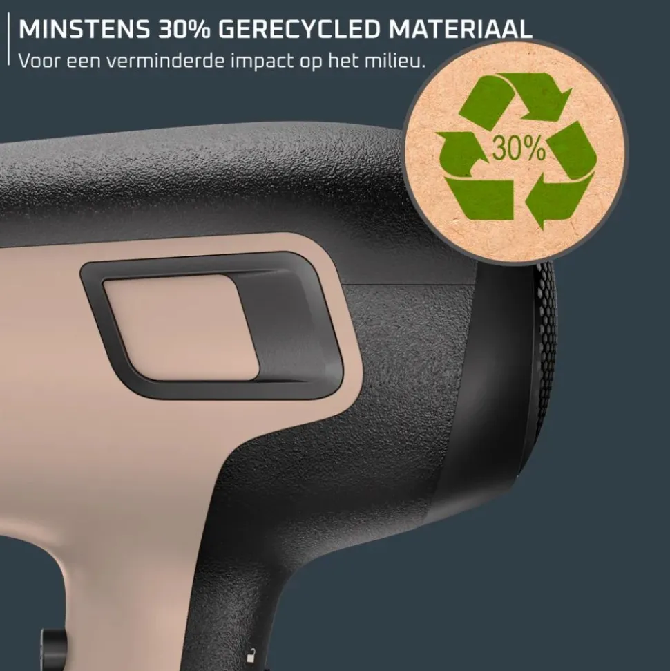 • Minstens 30% gerecycled materiaal (waarvan 60% gerecycled plastic)