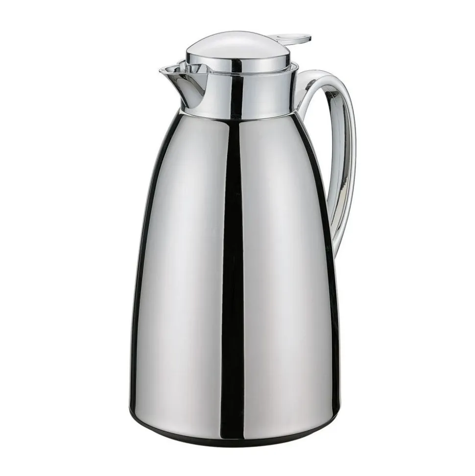 Met vacuümgehard glazen inzetstuk, schroefdop met praktische eenhandsgietknop, gepolijst roestvrij staal, vacuümgehard glazen inzetstuk, éénhandsgietknop, inhoud 1 liter, Ø 14 cm, hoogte 27 cm, roestvrij staal