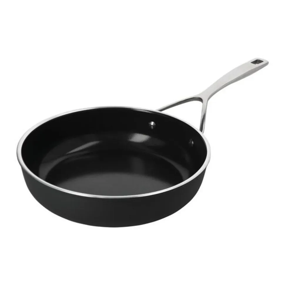 In de Alu Pro 5 hoge bakpan van 24 centimeter bak je met gemak roerei voor een hele tafel brunchgasten, een royale groentemix, een extra large portie scampi’s of enkele flinke kipfilets. Zonder kleven toch een krokant jasje? Check! En dat met minder vetstof. Je bereiding laat zich makkelijk omdraaien en serveren. Eenvoudiger en lichter verteerbaar, wat wil je nog meer? De keramische Ceraforce® antikleeflaag is ook een gezonde oplossing omdat ze volledig vrij is van PFAS. Beter voor jou en voor wie je kookt, en een pak milieuvriendelijker vergeleken met een traditionele anti-aanbaklaag. Gebruik enkel accessoires van hout of silicone, om beschadiging te voorkomen. De body in gesmeed aluminium is extra dik en meer dan stevig. Dankzij de unieke Radiant bodem is en blijft je pan extra stabiel en in optimaal contact met de kookplaat. De warmte verspreidt zich egaal. De exclusieve TriplInduc® technologie presteert perfect op inductie. Je hebt tot 30% minder energie nodig voor dezelfde temperatuur. Deze pan reageert supersnel zodra je overschakelt naar een andere fornuisstand. Geschikt voor alle kookplaten, zeker voor inductie. Met Alu Pro 5 haal je doordacht en vlot hanteerbaar design in huis, met een ijzersterke prijs-kwaliteitverhouding. Het matzwarte gesmede aluminium contrasteert prachtig met de blinkende roestvrijstalen greep. Dit lichtgewicht hanteer je supervlot en reinigen gaat als vanzelf. Ben je een liefhebber van grillen in de oven of van flamberen? Dan heb je ook een pan zonder antikleeflaag nodig.