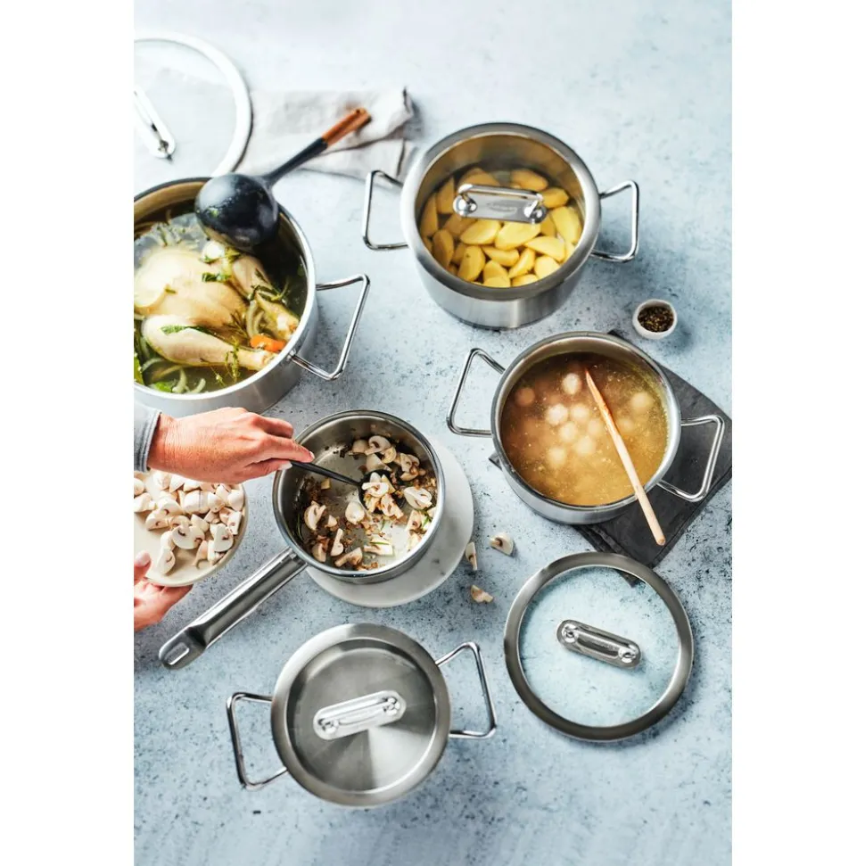 Een klassieke tomatensoep met balletjes of verse runderbouillon met juliennegroentjes, deze Diverto 3 soeppot van 24 cm in kwalitatief roestvrij staal is je graag trouw van dienst. De bodem verdeelt de warmte vlot en houdt ze goed vast. Op elk fornuis, ook inductie. Het robuuste deksel bewaart de stoom en de warmte zorgvuldig. Door het glas hou je eenvoudig in het oog hoe het kookproces vordert. Dankzij de speciale gietrand giet je zonder gemors water af en hevel je makkelijk sauzen en soepen over. Voor nog meer gebruiksgemak zorgt de handige maataanduiding aan de binnenkant. De stevige grepen zijn vastgelast voor extra hygiëne. Afwassen doe je in een handomdraai. Je Diverto 3 soeppot staat zo weer te blinken voor jouw volgende missie.