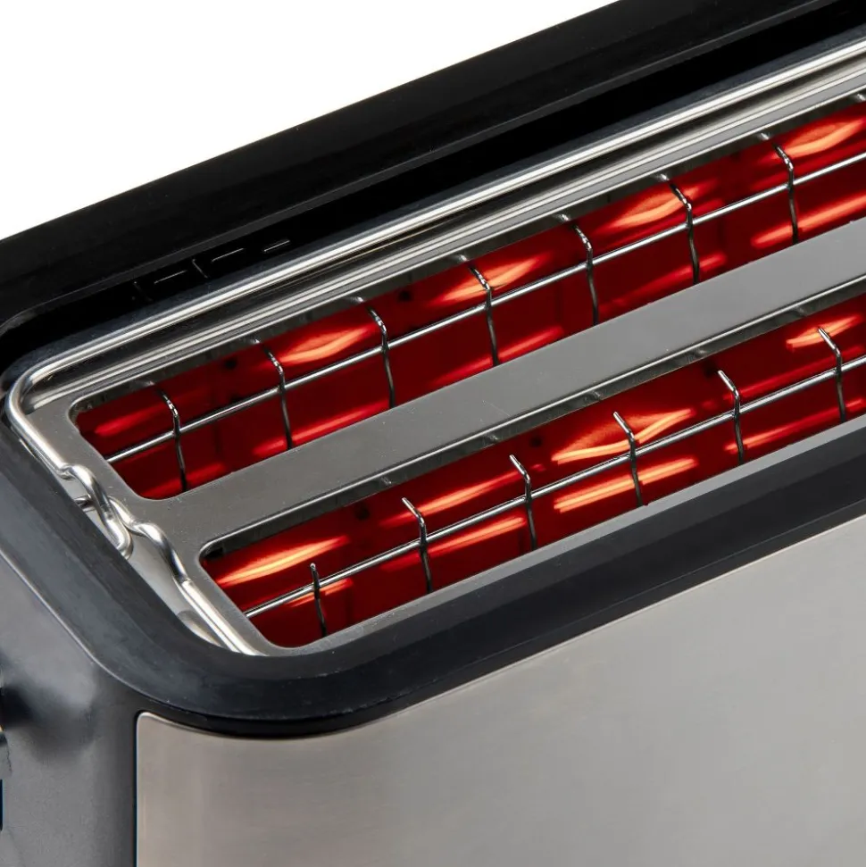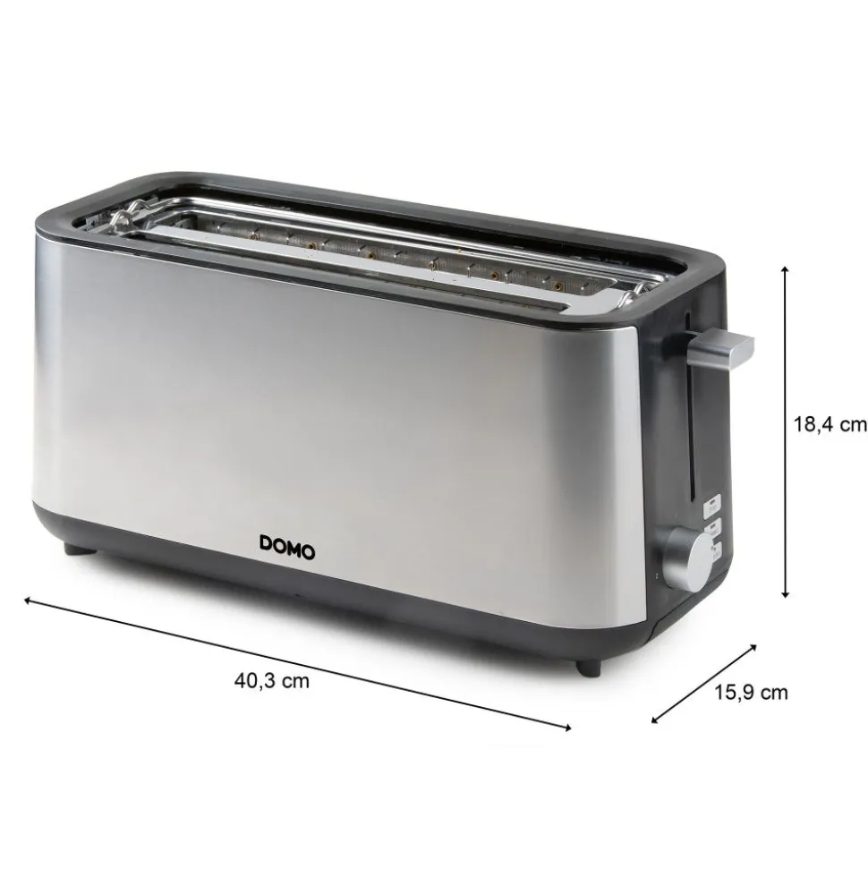 Ontdek de perfecte aanvulling op jouw keuken met de roestvrijstalen broodrooster DO967T van DOMO! Met zijn 2 ruime sleuven, ideaal voor het roosteren van 4 toasts tegelijk, bespaar je tijd en geniet je samen van een heerlijk ontbijt. Dankzij het ingebouwde broodjesrek verwarm je eenvoudig broodjes en croissants tot ze lekker knapperig zijn. Met de bruiningscontrole kies je uit 7 standen om jouw toast precies zo te krijgen als jij dat wilt. Heb je jouw toast even laten staan? Geen probleem, met de heropwarmfunctie krijg je die weer krokant zonder dat hij verder bruint. De ontdooifunctie zorgt ervoor dat bevroren brood snel en gelijkmatig ontdooit.