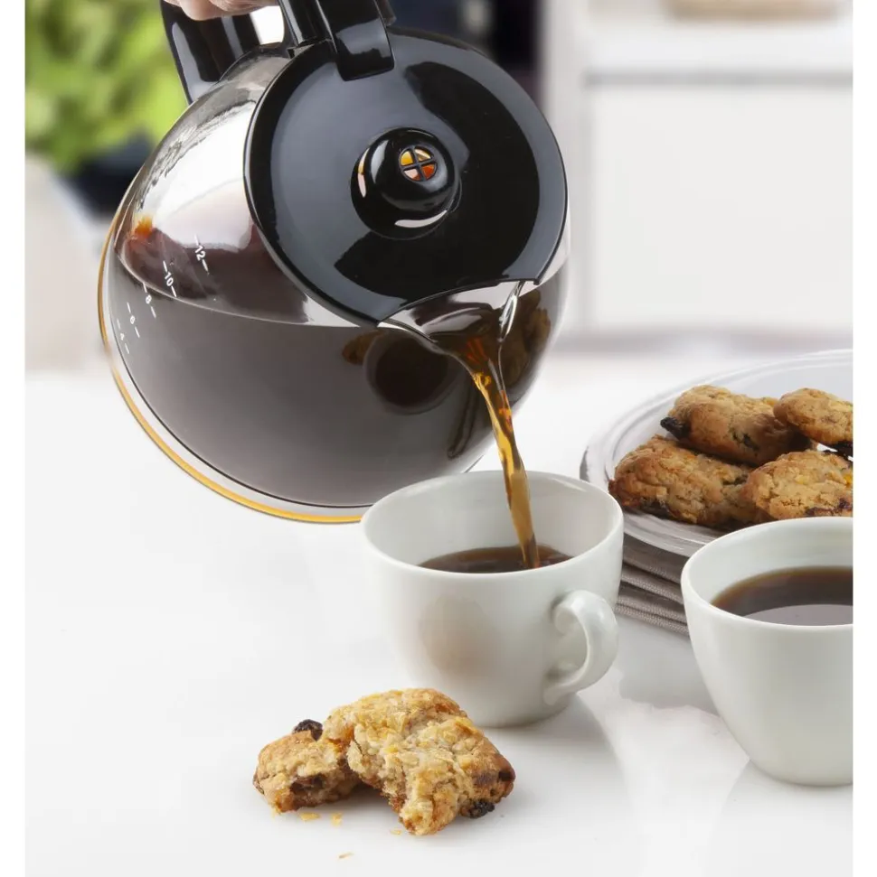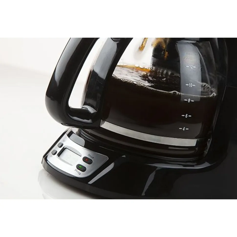 – Inhoud 1,5 l – 12 tassen – Bedieningspaneel met lcddisplay – Timer tot 24 uur – Automatische uitschakeling na 40 min. – Verwijderbare filter – Druppelstop – Glazen kan van hoge kwaliteit – Hoogwaardige roestvrijstalen afwerking