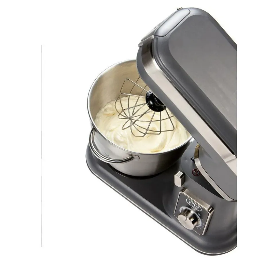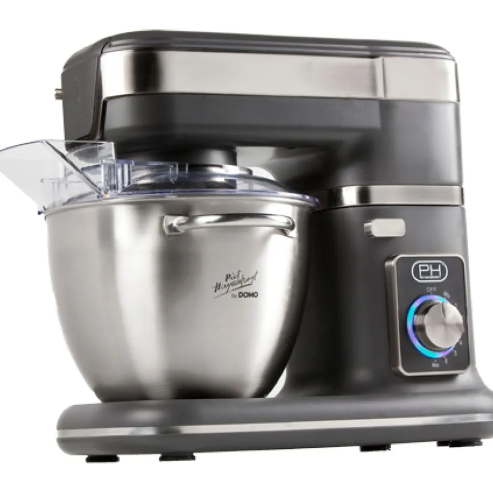 De keukenrobot van DOMO heeft een krachtige motor van 1000 W. De kom uit geborsteld roestvrij staal heeft een inhoud van 4,5 liter en heeft een afneembaar, transparant antispatdeksel met vulopening. De snelheid kan je permanent en traploos instellen met de handige draaiknop met 8 standen. De planetaire werking van de keukenrobot zorgt voor een perfect mengresultaat. Het toestel wordt geleverd met klopper, deeghaak en roestvrijstalen ballongarde. Naast de versie in ‘Anthracite grey’ is de keukenrobot ook verkrijgbaar in andere kleuren.