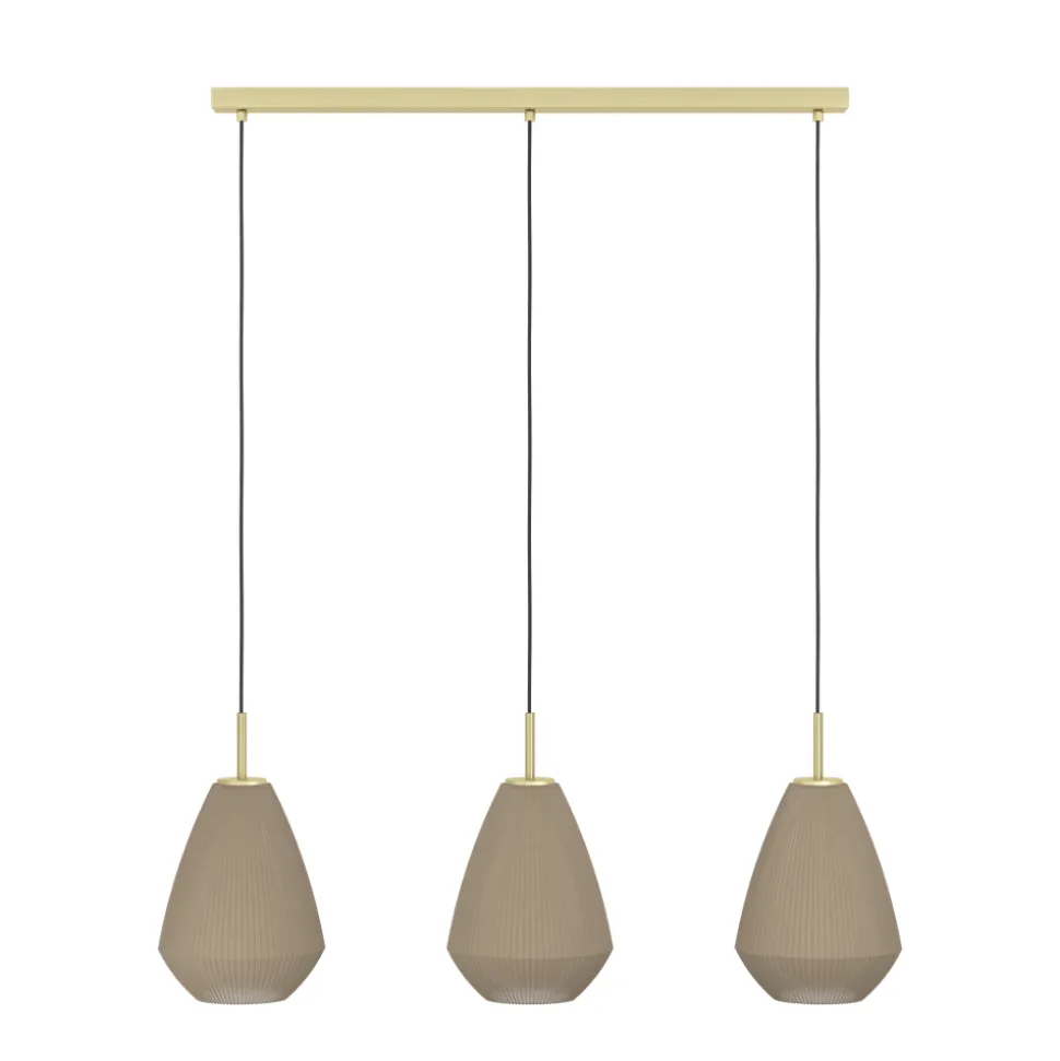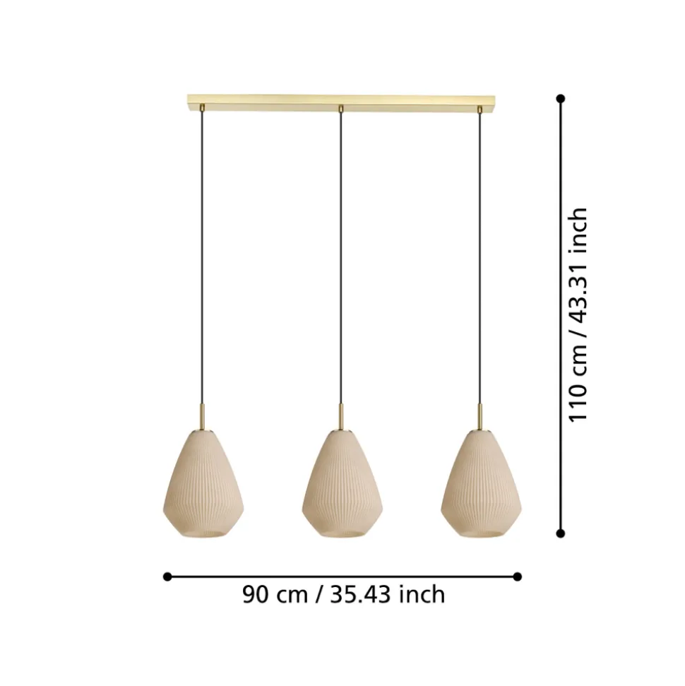 Deze CAPRAROLA hanglamp is gemaakt van een cirkelvormige basis in messing geborsteld staal met daaraan drie lampenkappen van zandkleurig gesatineerd glas. De lamp is 90cm lang, 20cm breed en heeft een maximale verstelbare hoogte van 110cm. Hij heeft drie E27 lichtbronnen nodig om je eetkamer sfeervol te verlichten.