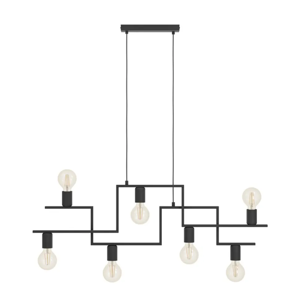 De FEMBARD-vering bestaat uit twee zwarte metalen staven die ten opzichte van elkaar verspringen. Dankzij de verschillende oriƫntaties van de armen worden de zeven zichtbare houders op verschillende hoogten en posities geplaatst. Dit geeft het armatuur een originele toets en maakt het tot een van de middelpunten van de ruimte waarin het wordt geplaatst, of dat nu in de woonkamer is of in de eetkamer, bijvoorbeeld boven een lange tafel. De hanger kan worden gecombineerd met bijna elke interieurtrend. De afgebeelde lichtbronnen zijn niet inbegrepen. De armatuur is compatibel met elke E27 lamp.