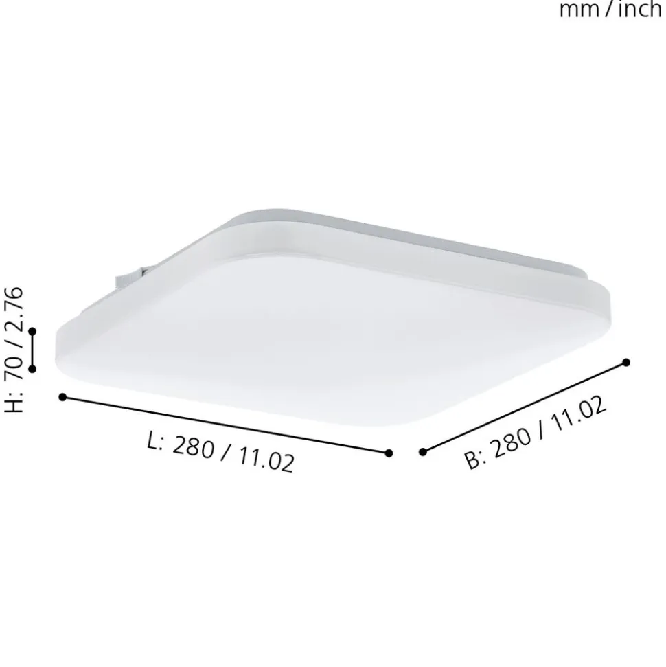 De LED-plafondlamp FRANIA bestaat uit een vierkante witte kunststof kap met afgeronde hoeken en een wit metalen achterzijde. De geïntegreerde LEDs geven een aangenaam warm wit licht. De eenvoudige plafondlamp met een afmeting van 28 x 28 cm biedt tijdloze verlichting en kan ook probleemloos als wandlamp worden gebruikt. Het past perfect in moderne interieurs, bijvoorbeeld in de keuken, woonkamer, slaapkamer of hal.