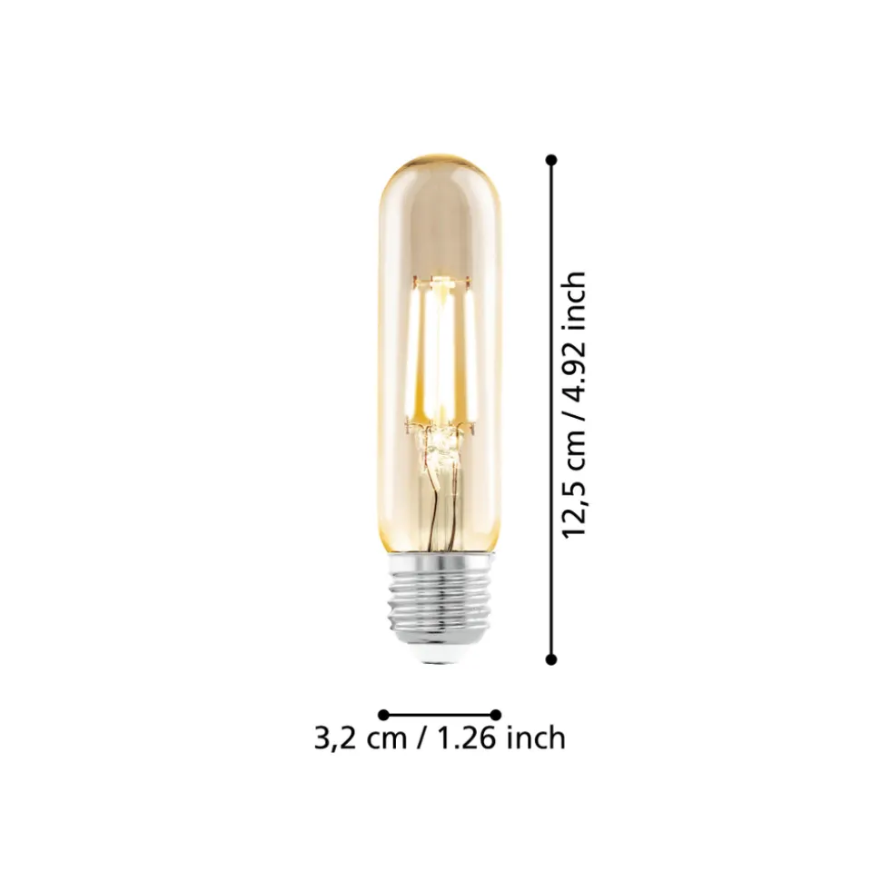 De E27 LED lichtbron is gemaakt van amberkleurig glas. De 4 Watt LED lamp (T32) straalt een aangenaam warm wit licht van 270 lumen. Dankzij het trendy vintage goud effect en de slanke vorm kan deze LED lamp ook perfect gebruikt worden in een slank verlichtingslichaam en zal het een blikvanger zijn in elke kamer.