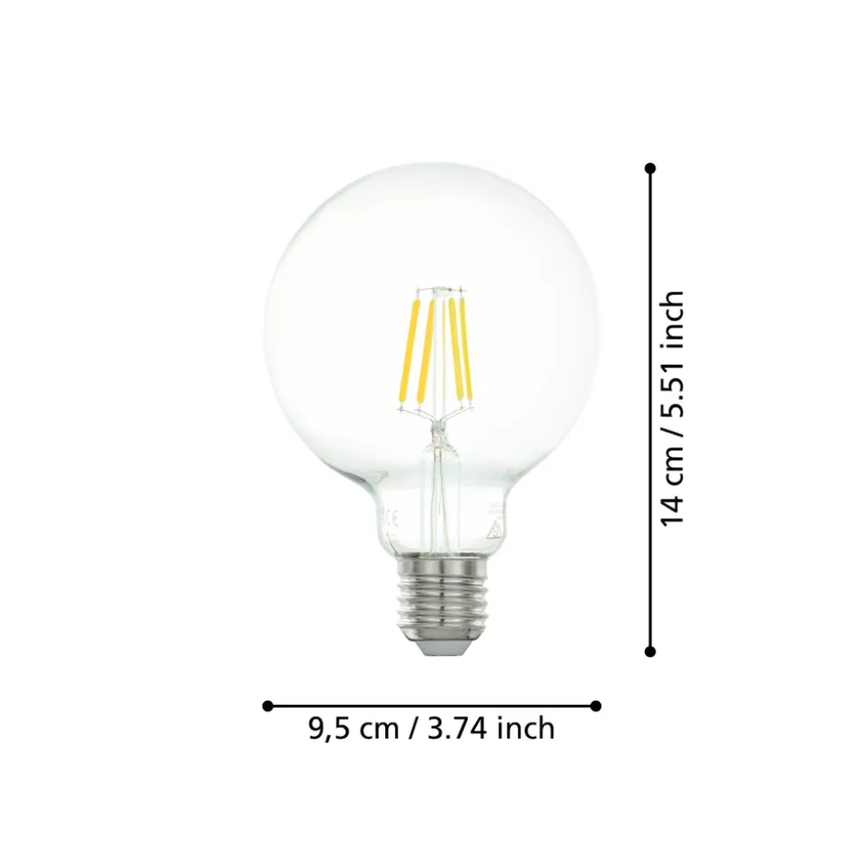 De E27 LED lamp met zichtbaar filament is gemaakt van helder glas. De klassieke 4 Watt LED lamp (G95) geeft een aangenaam warm wit licht van 470 lumen.