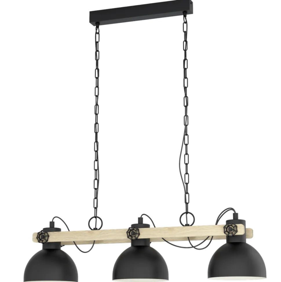 De hanglamp LUBENHAM bestaat uit drie draaibare kappen van zwart metaal met een crèmekleurige binnenkant. De kappen zijn bevestigd aan een lichaam van metaal en hout, dat op zijn beurt is opgehangen aan twee kettingschakels. Deze hanglamp is een slimme mix van hout en metaal en past perfect in de vintage en industriële trends. Het biedt unieke verlichting in je kamer, zowel in de woonkamer als in de eetkamer, bijvoorbeeld boven een lange tafel. Dit armatuur is compatibel met elke E27-lichtbron (niet inbegrepen). Dit Lubenham armatuur heeft een FSC-label wat wil zeggen dat het hout uit een bos komt waar aan verantwoord en duurzaam bosbeheer gedaan wordt. Hiermee wordt het ecosysteem van het bos in stand gehouden en worden zaken als vervuiling en schade tegengegaan, terwijl biodiversiteit en waterhuishouding beschermd worden.