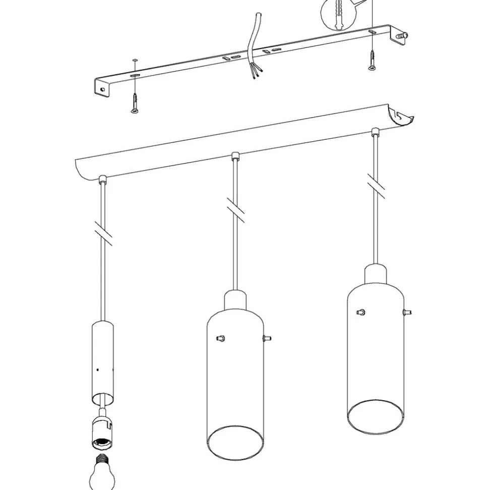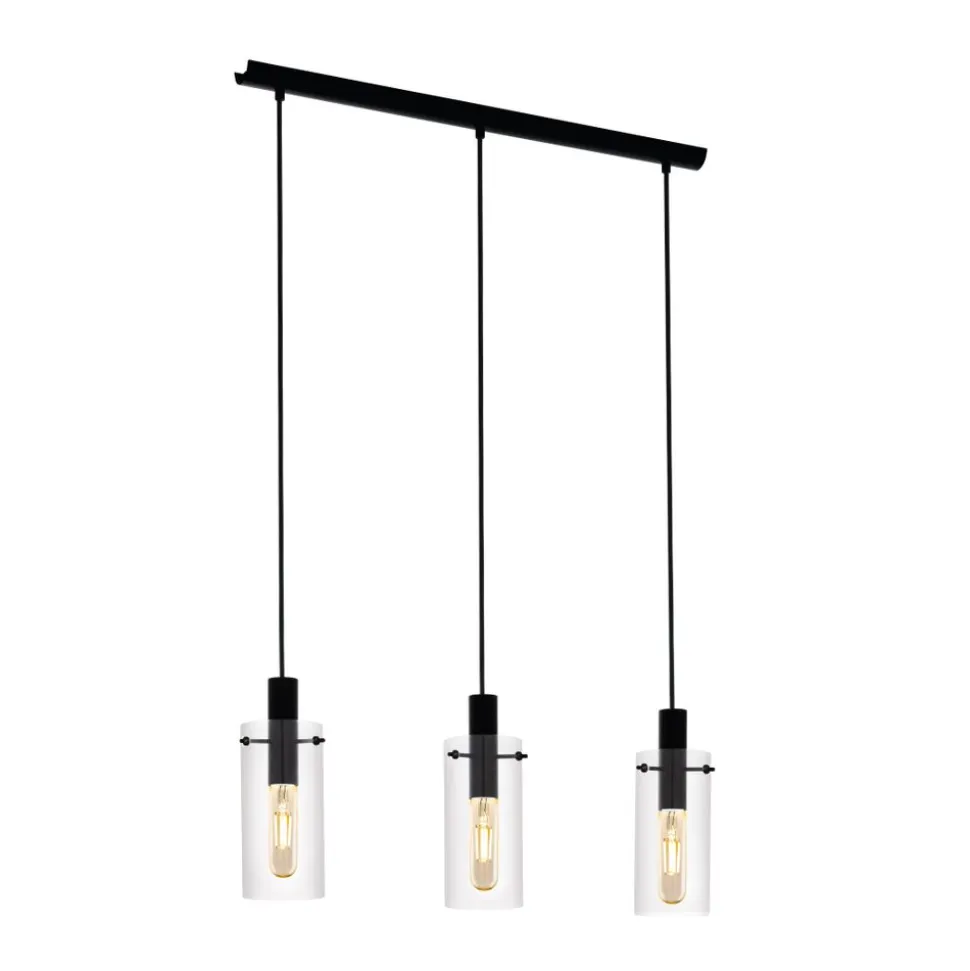 De hanglamp MONTEFINO bestaat uit drie transparante glazen cilinders die aan zwarte metalen houders hangen. De transparante glazen kappen geven direct zicht op de lampen binnenin. De armatuur hangt aan een rechthoekige zwarte metalen kap. Deze hanger geeft de finishing touch aan een modern interieur en zorgt voor stijlvolle verlichting in de woonkamer of eetkamer. De afgebeelde lichtbronnen zijn niet inbegrepen. De armatuur is compatibel met langwerpige E27 lichtbronnen.
