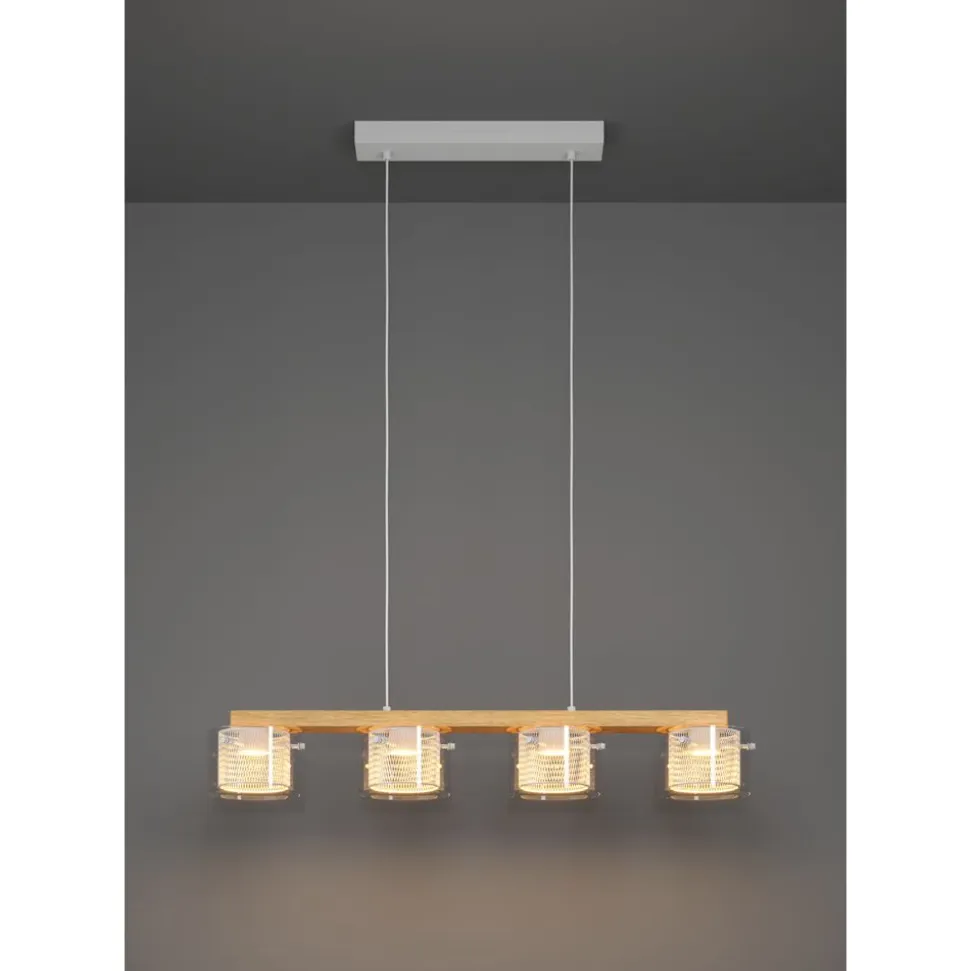 De LED hanglamp PORTICO-Z maakt deel uit van de connect.z productlijn. De hanglamp heeft een houten behuizing met vier glazen lampenkappen, elk met een stalen gaascilinder erin. De geïntegreerde LED’s produceren een regelbaar licht dat naar wens kan worden aangepast. Je kunt kiezen uit warm wit, neutraal wit en koel wit licht, en een breed scala aan RGB-kleuren. Het licht kan worden bediend met een gratis app (AwoX HomeControl), die ook andere functies biedt zoals helderheidsaanpassing, timerbediening, aanwezigheidssimulatie en nog veel meer. Het product maakt gebruik van Bluetooth en ZigBee 3.0 en kan ook worden bediend met compatibele spraakassistenten. De hanglamp kan ook bediend worden met een afstandsbediening, die apart verkrijgbaar is. Met een modern ontwerp past de lamp naadloos in verschillende interieurstijlen en biedt stijlvolle verlichting voor elke ruimte, of het nu in de woonkamer is of boven de eetkamertafel.