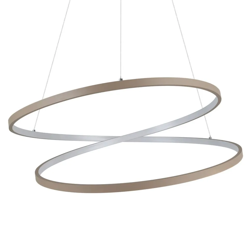 De RUOTALE LED hanglamp bestaat uit een harmonische ronde LED-balk van zandkleurig metaal met een wit kunststof verlichtingsoppervlak aan de binnenkant. De staaf is door middel van drie metalen kabels opgehangen aan een ronde zwarte metalen kap. De geïntegreerde LEDs stralen een indirect warm wit licht uit. De ophanging past perfect in moderne interieurs en is een blikvanger in de woonkamer of eetkamer boven de tafel.