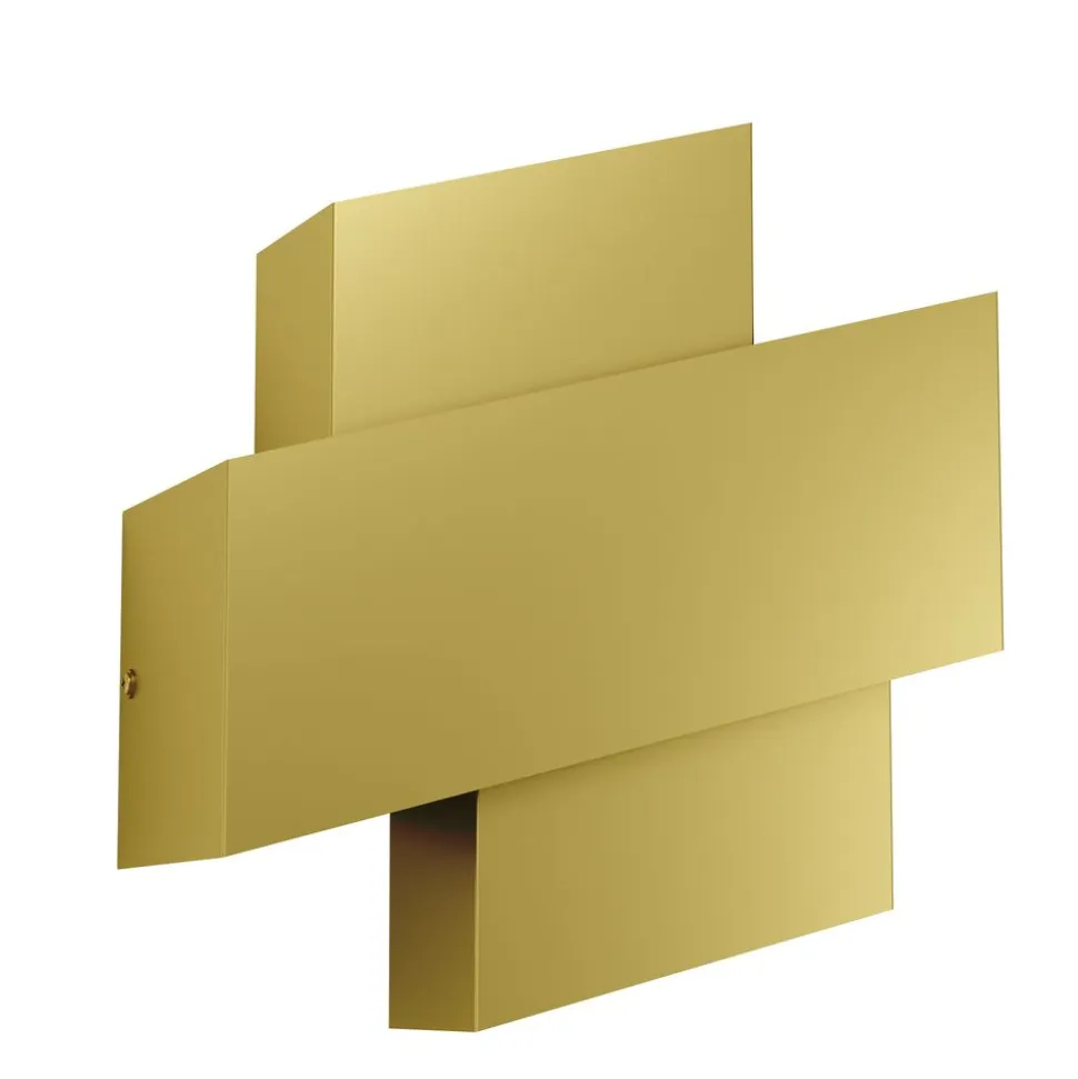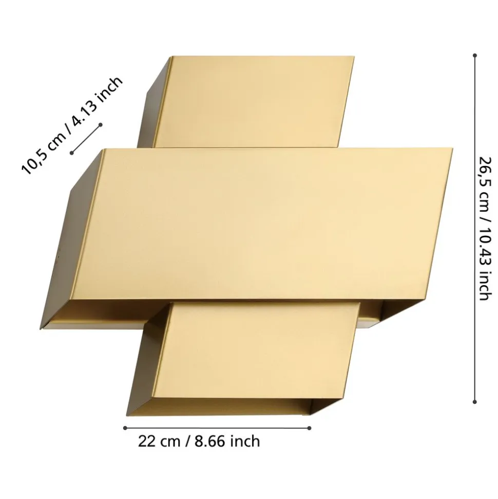 De TIMPAROSSA wandlamp bestaat uit een goudkleurig metalen lichaam met drie parallelepipeda die in een hoek ten opzichte van elkaar zijn geplaatst. De openingen boven en onder de lamp zorgen voor een comfortabele, indirecte verlichting naar boven en beneden op de muur. De wandlamp past perfect in minimalistische interieurs en biedt moderne verlichting voor elke ruimte – of het nu in de keuken, woonkamer, slaapkamer, hal of eetkamer is. De afgebeelde lamp wordt niet meegeleverd. Het armatuur is geschikt voor alle lichtbronnen met E27 voet.