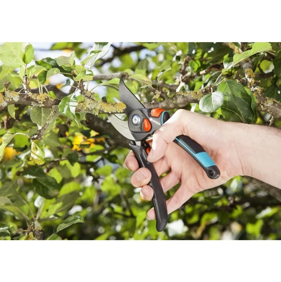 Met de GARDENA tuinschaar B/S-XL met een snijdiameter tot 24 mm kunt u vers hout met een grotere diameter snoeien, zoals sterkere takken en twijgen. De snoeischaar heeft ergonomisch gevormde en met glasvezel versterkte ErgoTec-handgrepen. De ingebouwde zachte componenten in beide handgrepen zorgen voor een stevige grip en voorkomen dat uw handen wegglijden. Bovendien ondersteunt de buffer een knipactie die gemakkelijk is voor de pols en de hand. Door de variabele greepopening kunt u de tuinschaar individueel aanpassen aan uw handgrootte. De kleinere greepbreedte is vooral handig om snel en gemakkelijk dunne takken en scheuten te knippen. Met behulp van het precisiegeslepen en niet-klevende bovenmes met bypass-knipprincipe knipt u zuiver en zacht voor de planten dankzij de geringe wrijving. Het ondermes is gemaakt van roestvrij staal. Na gebruik kunt u de snoeischaar gemakkelijk met één hand sluiten dankzij de praktische eenhandige veiligheidsvergrendeling en veilig opbergen. De tuinschaar B/S-XL is een kwaliteitsproduct, gemaakt in Duitsland. GARDENA geeft u een lange fabrieksgarantie van 25 jaar. Geef uitdrukking aan uw visie met precisie. Gebruiksvriendelijk, effectief en duurzaam snoeigereedschap voor creatieve tuiniers.