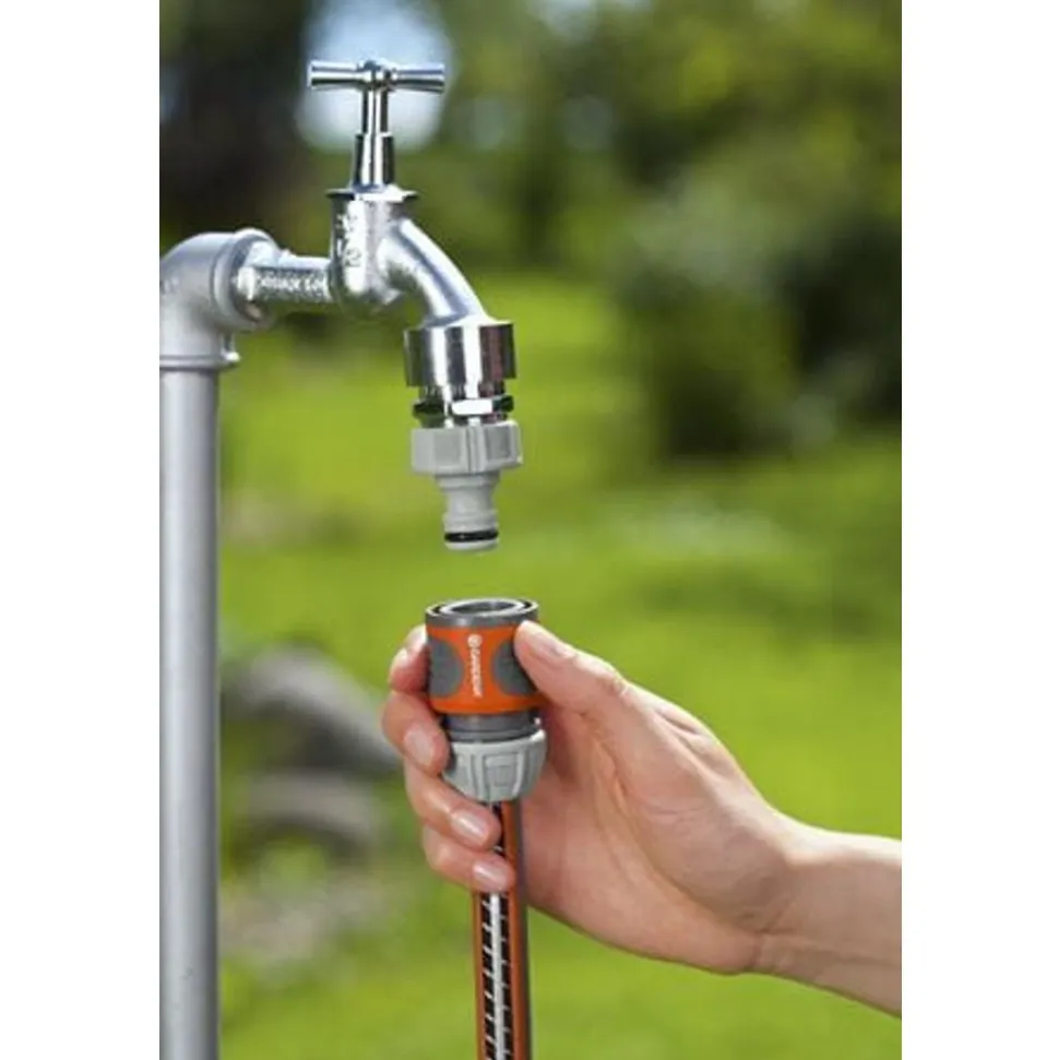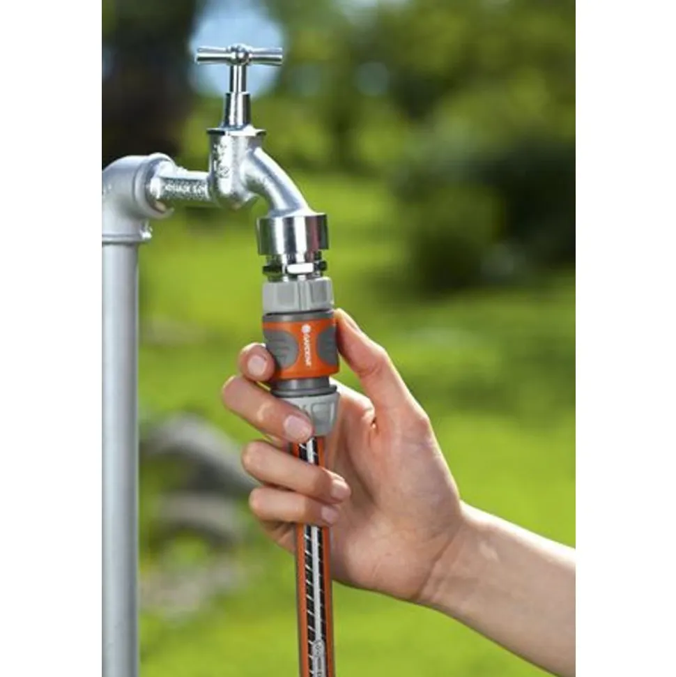 Het GARDENA slangstuk biedt een snelle en comfortabele verbinding met de slang. Door eenvoudig te trekken, kan het slangstuk losgemaakt worden. Het slangstuk is ideaal voor slangen van 13 mm (1/2”) en 15 mm (5/8”). De tuinslang kan eenvoudig aan de kraan verbonden worden. POWER GRIP: Speciaal gevormde wartelmoer voor eenvoudige en vaste verbinding, het GARDENA slangstuk ligt prettig en veilig in de hand. Een rubberen ring biedt een bijkomende bescherming voor het product.