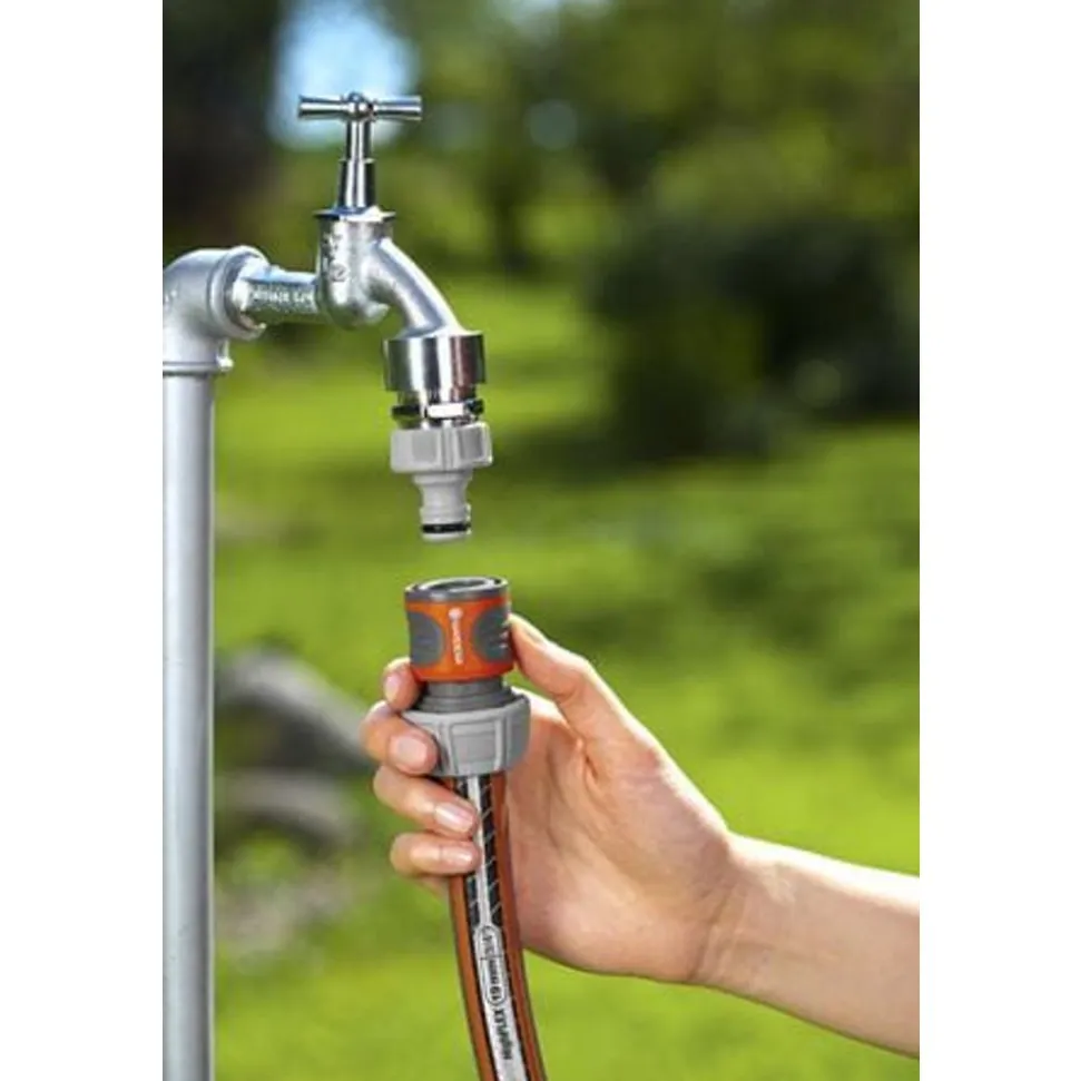 Het GARDENA slangstuk biedt een snelle en comfortabele verbinding met de slang. Door eenvoudig te trekken, kan het slangstuk losgemaakt worden. Het slangstuk is ideaal voor slangen van 13 mm (1/2”) en 15 mm (5/8”). De tuinslang kan eenvoudig aan de kraan verbonden worden. POWER GRIP: Speciaal gevormde wartelmoer voor eenvoudige en vaste verbinding, het GARDENA slangstuk ligt prettig en veilig in de hand. Een rubberen ring biedt een bijkomende bescherming voor het product.