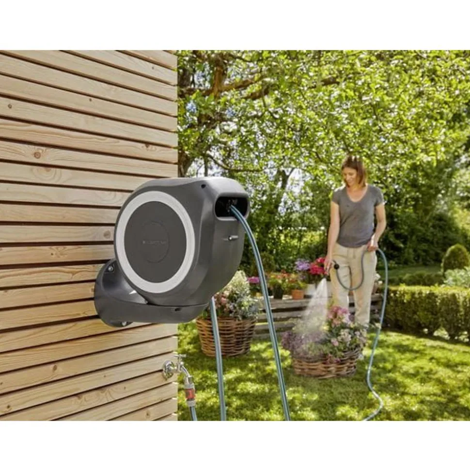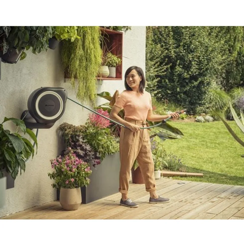 Tuinieren is handiger en gemakkelijker dan ooit met de wandslangenbox RollUp S. Deze helpt uw tuin netjes en opgeruimd te houden en voorkomt hinderlijk struikelgevaar als gevolg van een rondslingerende slang. De praktische slangopslag is eenvoudig aan de muur van uw huis te bevestigen en wordt met een flexibele aansluitslang aangesloten op de kraan. Dankzij de stevige muurbeugel kan de slangenbox meer dan 180 graden worden gedraaid, zodat u elke hoek van uw tuin moeiteloos kunt bereiken. Voor direct gebruik kunt u de tuinslang eenvoudig verlengen tot een lengte van maximaal 15 meter. De tuinslang wordt automatisch in heel korte intervallen vergrendeld zodra u stopt, wat betekent dat de slang eenvoudig en gemakkelijk te hanteren is. Door lichtjes aan het uiteinde van de slang te trekken, wordt de vergrendeling ontgrendeld en een ingebouwde stalen veer met innovatieve RollControl-technologie zorgt voor soepel en gecontroleerd oprollen. De RollControl beschermt de slangenbox en de omgeving tegen schade als gevolg van het te snel inrollen. Om knikken of knopen in de slang te voorkomen, heeft de box een geïntegreerde slanggeleider. Dankzij de slang- en kraanaansluitingen van het Original GARDENA System kunt u eenvoudig en flexibel een verlengstuk of ander compatibel GARDENA element op de slang aansluiten. U hebt altijd uw GARDENA slangopzetstukken bij de hand. Ze kunnen onder de muurbeugel worden bevestigd en daar worden opgeborgen om ruimte te besparen. De GARDENA wandslangenbox is UV- en vorstbestendig en kan het hele jaar door probleemloos aan de muur van het huis blijven bevestigd. Het hoogwaardige materiaal biedt u een lange levensduur en gebruiksgemak zonder onderhoud. Samen met de wandslangenbox ontvangt u een muurbeugel, een flexibele aansluitslang, alle benodigde Original GARDENA System en montageonderdelen en een mondstuk met twee verschillende sproeiopties. Dit hoogwaardige product wordt geleverd met een garantie van vijf jaar van GARDENA. Bewatering die altijd gebruiksklaar is , dankzij de GARDENA wandslangenbox RollUp S.