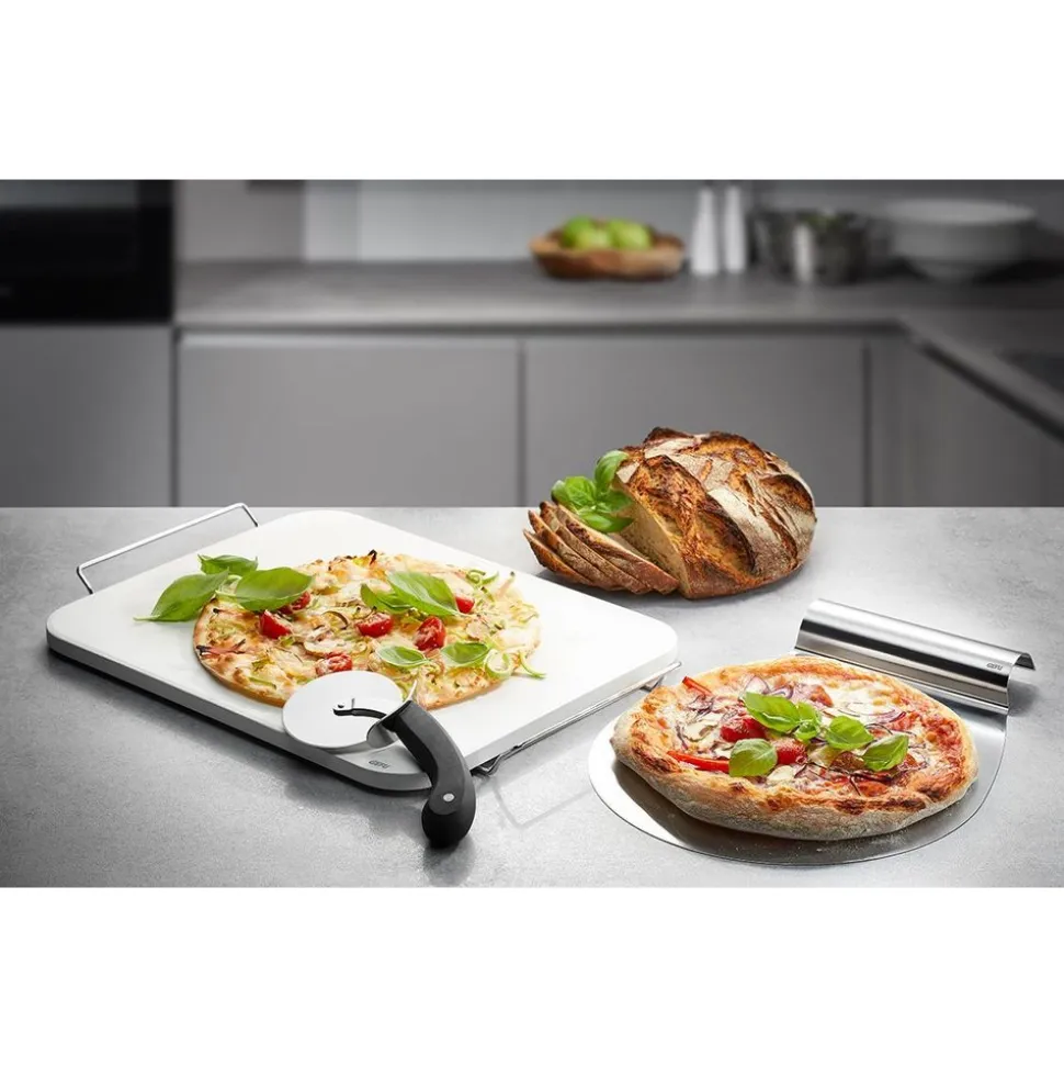 Pizza net als in Bella Italia! Geniet thuis van pizza, net als in een Italiaans restaurant. De professionele pizzasteen, met zijn handige standaard, verdeelt de warmte gelijkmatig en neemt vocht op. Het resultaat is een heerlijk knapperige basis. Dankzij de pizzaschep schuif je de pizza heel eenvoudig op de steen om te bakken en op het bord om te serveren. De scherpe pizzasnijder snijdt hem moeiteloos in kant-en-klare porties. Buon Appétito!