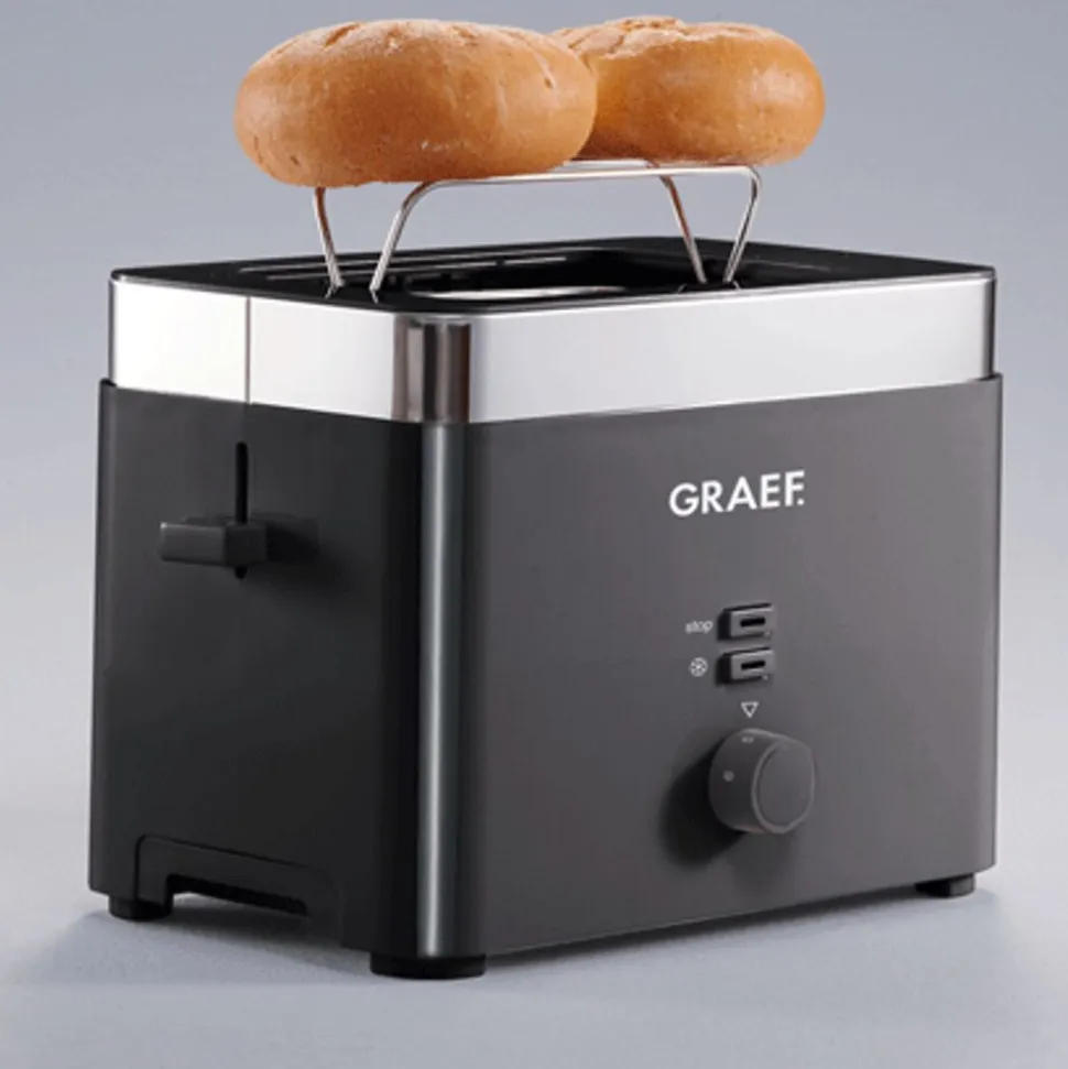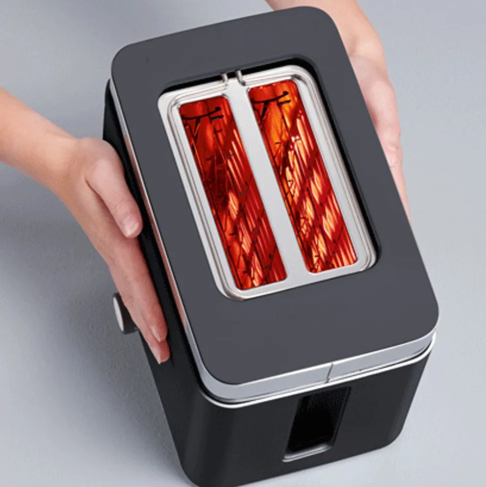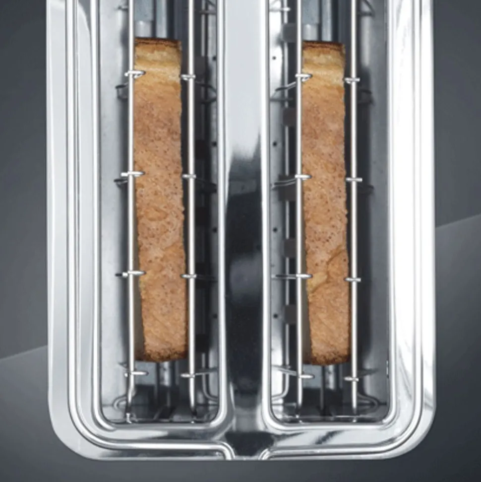 Toaster met 2 sleden. Kunststof uitvoeren en ‘COOL WALL’ behuizing. Automatische centrering van het brood. ‘STOP’- en ‘ONTDOOI’ toets. Regelbare bruiningsgraad (6 standen). ‘SOFT LIFT’ functie voor het voorzichtig omhoog komen van de toast. ‘EXTRA LIFT’ functie voor het makkelijk uitnemen van de toast. Uitneembare kruimellade. Geleverd met opzetstuk op pistoletjes op te warmen, kan ook gebruikt worden als toastrekje. Zeer stabiel dankzij de antislipvoetjes.
