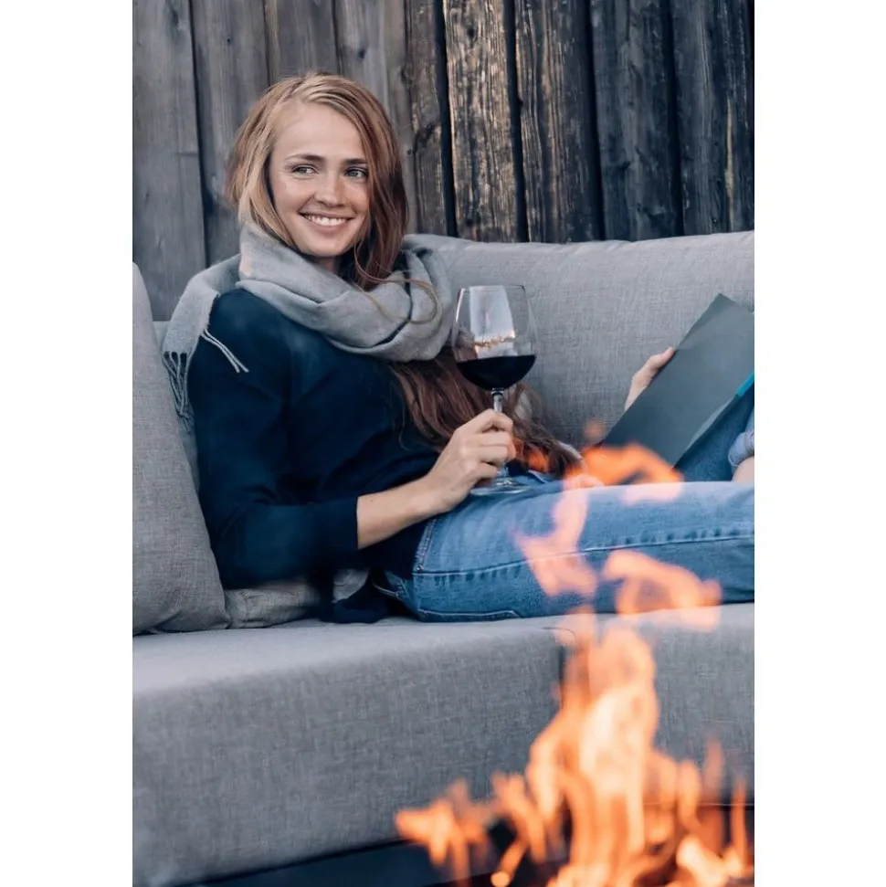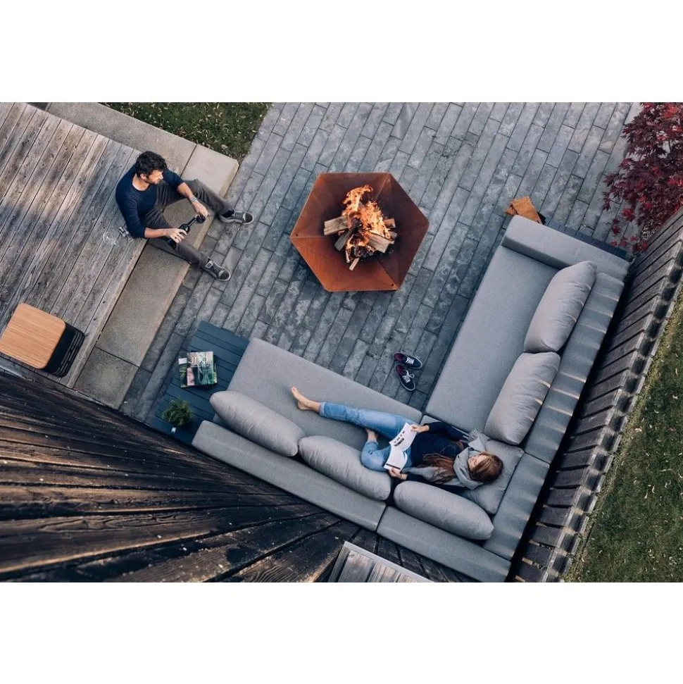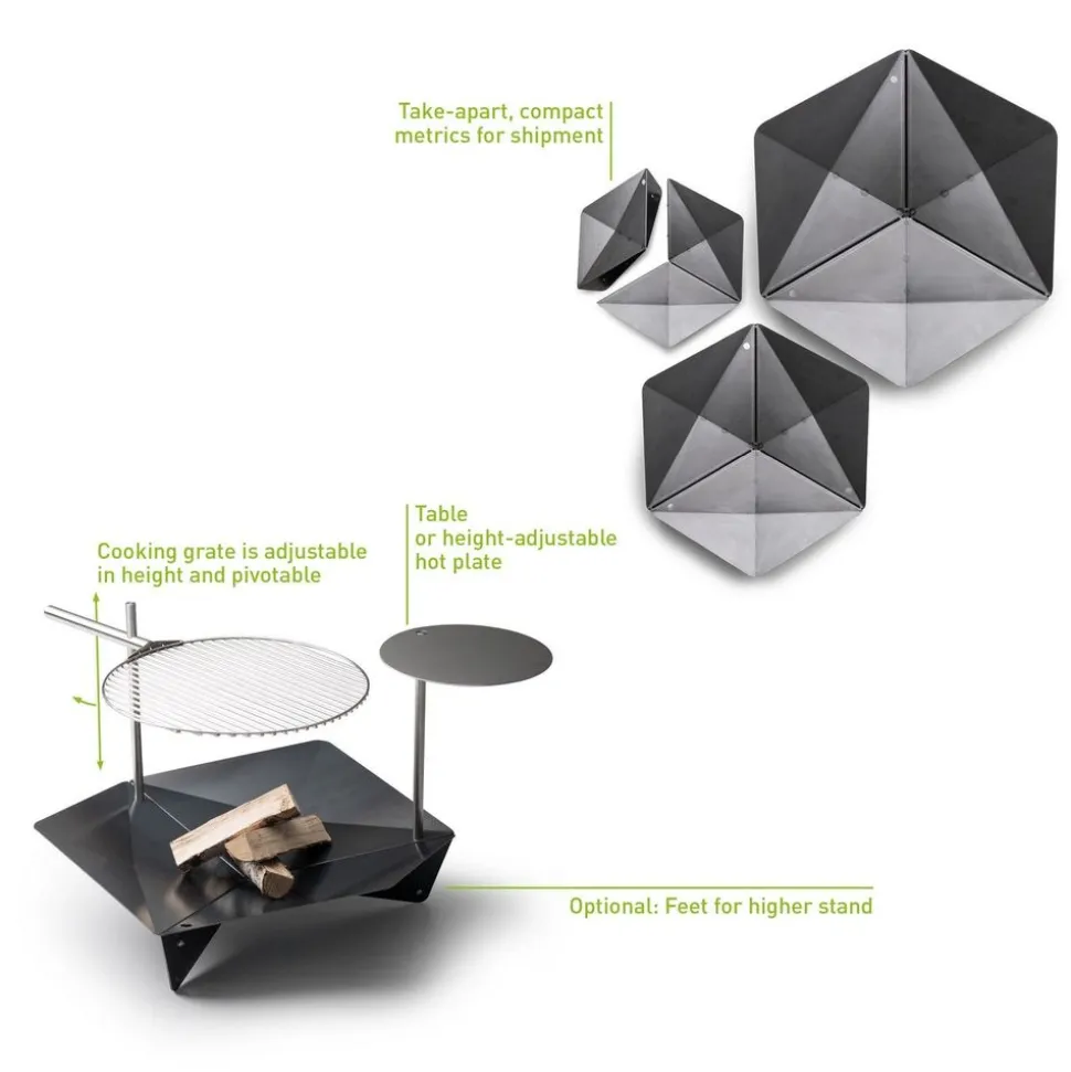 TRIPLE – is een eerbetoon aan de oorsprong van de open haard! De fascinerende zeshoekige vorm geeft een duidelijk zicht op de laaiende vlammen. Puur kampvuurgevoel van alle kanten. En wanneer komt de honger? Gewoon op het grillrooster, de plaat of beide plaatsen en beginnen met barbecueën!