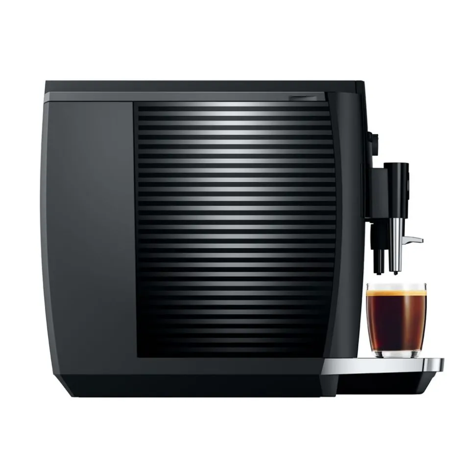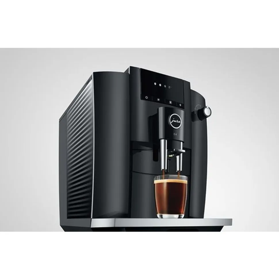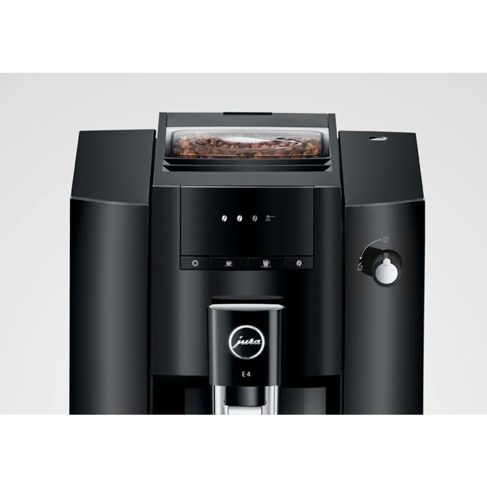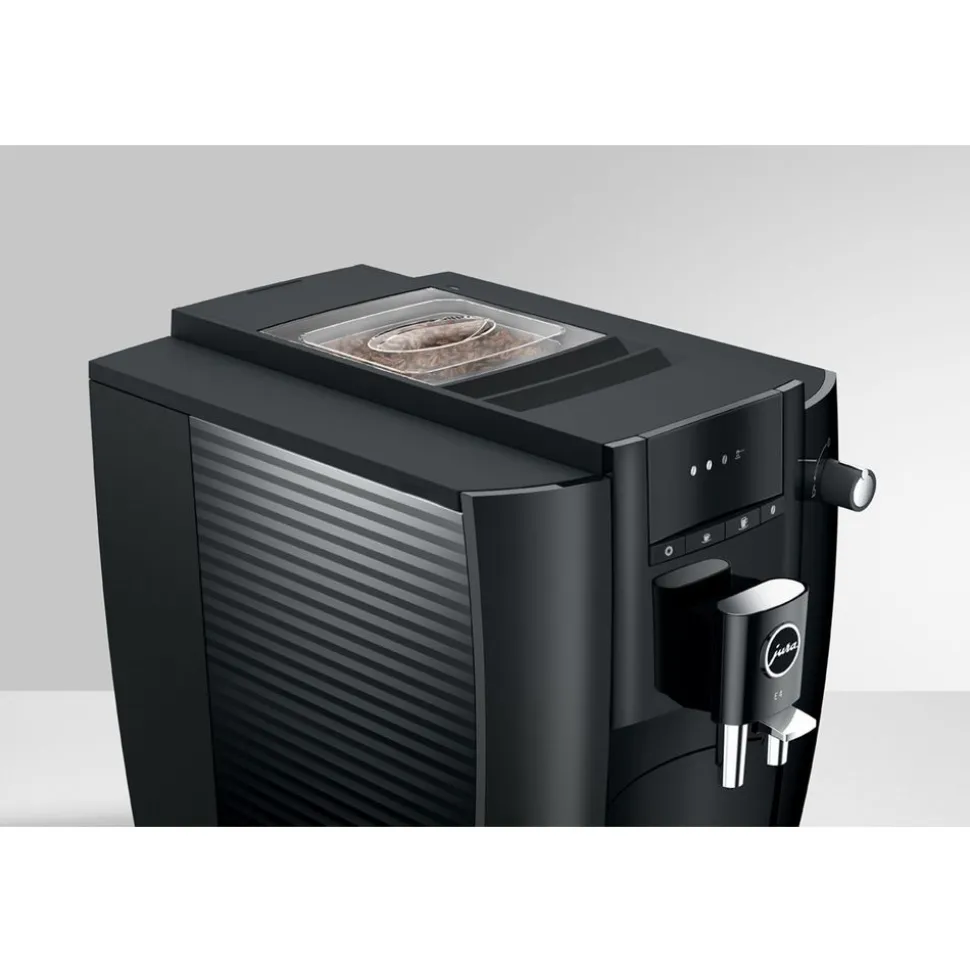 De E4 heeft het karakteristieke design van de JURA-volautomaten. Kenmerkend zijn de strakke vlakken en duidelijke contouren. Het vereenvoudigde design met zeer nauwkeurige afwerking onderstreept de premiumkwaliteit van de volautomaat nog eens extra. Purisme spreekt ook uit de keuze van de kleur. Terwijl de volledige behuizing in discreet Piano Black is gehouden, zorgen verchroomde highlights voor hoogwaardige accenten waardoor de volautomaat kwaliteit uitstraalt.