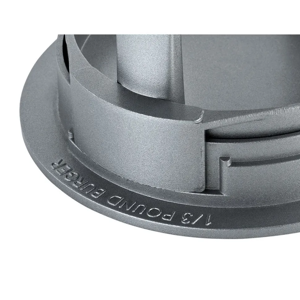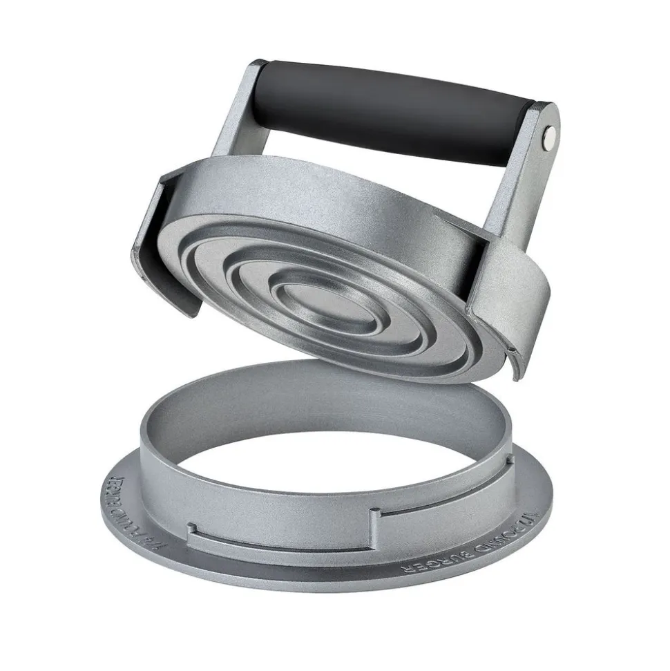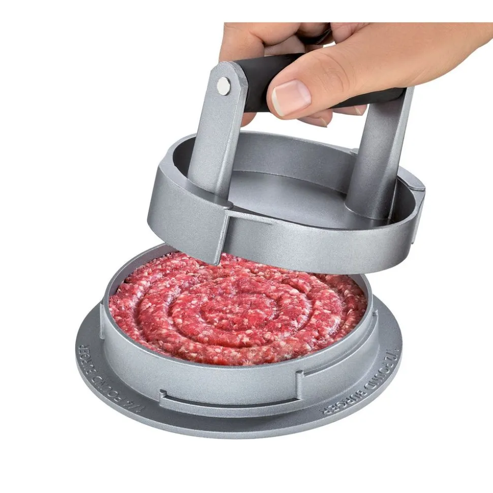 Wat is er beter dan een hamburger? Drie van hen! Dat is wat de TRIO hamburgerpers van KÜCHENPROFI levert. Afhankelijk van welke markering je kiest op de buitenring van de stempel, ontvang je een burgerpasteitje van ca. 125, 170 of 230 gram. De bediening is in ieder geval eenvoudig. Vet de onderste pan lichtjes in of bekleed deze met bakpapier. Plaats vervolgens het gehakt erin en druk het bovenste gedeelte er stevig op. Als u wilt, kunt u uw pasteitje op smaak brengen met “natte kruiden”, d.w.z. verse pepers, uien of pittige sauzen.