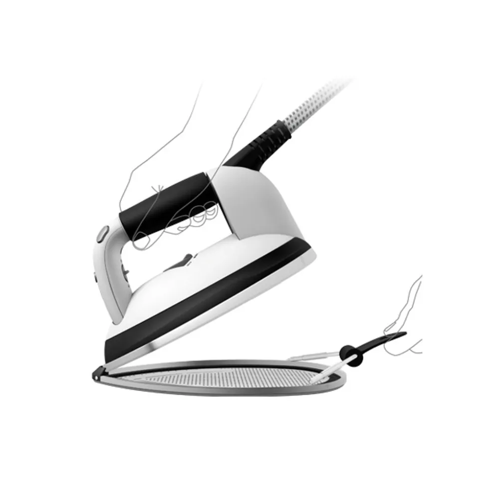 De 3D-beschermzool klikt gemakkelijk vast op het Laurastar strijkijzer. Plaats eerst de punt van het strijkijzer aan de voorkant van de beschermzool, laat het strijkijzer dan zakken en klik het vast in de zool met behulp van het lipje aan de achterkant. Wacht ongeveer 2 minuten totdat de zool de juiste temperatuur heeft bereikt voor een zorgzame strijkbeurt.