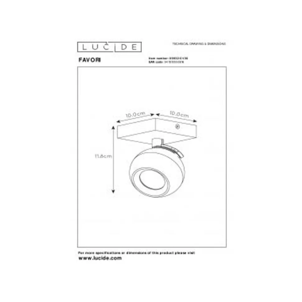 Lichten uit, spotlights aan. De compacte Favori plafondspot volgt je waar je maar wil, in welke richting dan ook. Met zijn ronde, afgeplatte bol is hij een charmante verschijning aan het plafond. Ideaal om een mooi kunstwerk te belichten, sfeer te brengen in de gang of je te vergezellen in de slaapkamer. Deze opbouwspot is 10 op 10 centimeter en net geen 12 centimeter hoog. Je sluit Favori makkelijk aan op een dimmer voor de ideale lichtintensiteit op elk moment van de dag.