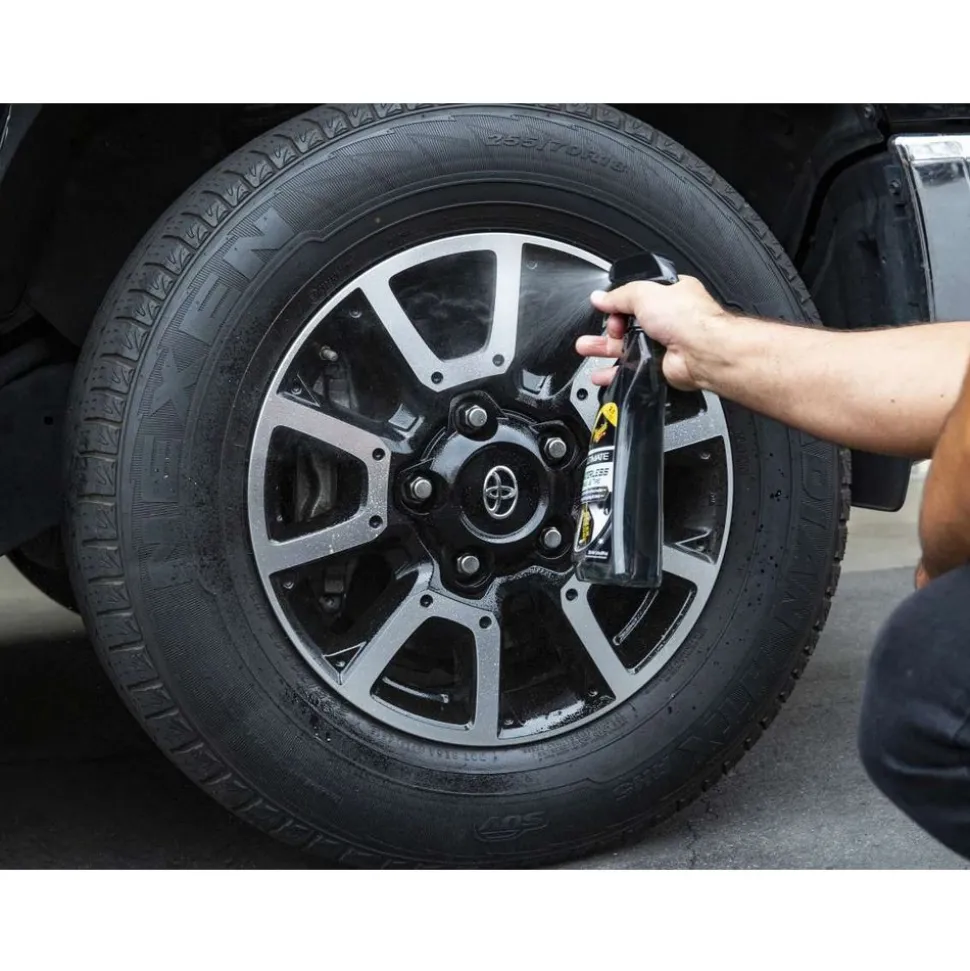 2 producten in 1, reinigt uw velgen en maakt uw banden diepzwart.