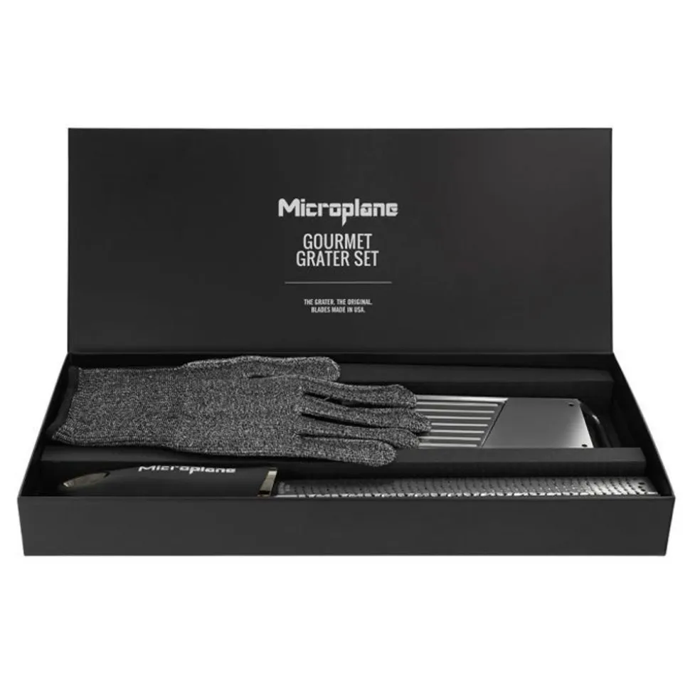 cadeauset Microplane bestaande uit Microplane premium classic zester, gourmet slicer en beschermende handschoen