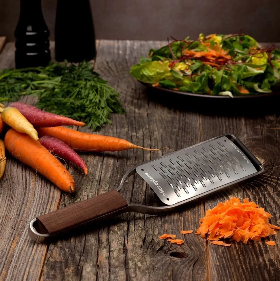Microplane® lanceert Master Series, een nieuwe collectie elegant ontworpen handraspen vervaardigd in walnoot en roestvrij staal. De Master Series weerspiegelt het iconische erfgoed van de houtwinkel van Microplane en de populaire ambachtelijke styling van vandaag en biedt het beste op het gebied van eigentijdse styling, duurzaamheid en onberispelijke prestaties. De uitzonderlijk mooie, geoliede notenhouten handgrepen (hout afkomstig uit de VS) liggen comfortabel in de hand en voegen een opvallend warm en chique design toe aan keukendecors. Met keer op keer superieure resultaten en jarenlang plezier, is de Master Series de perfecte keuze voor de vakman in de keuken.