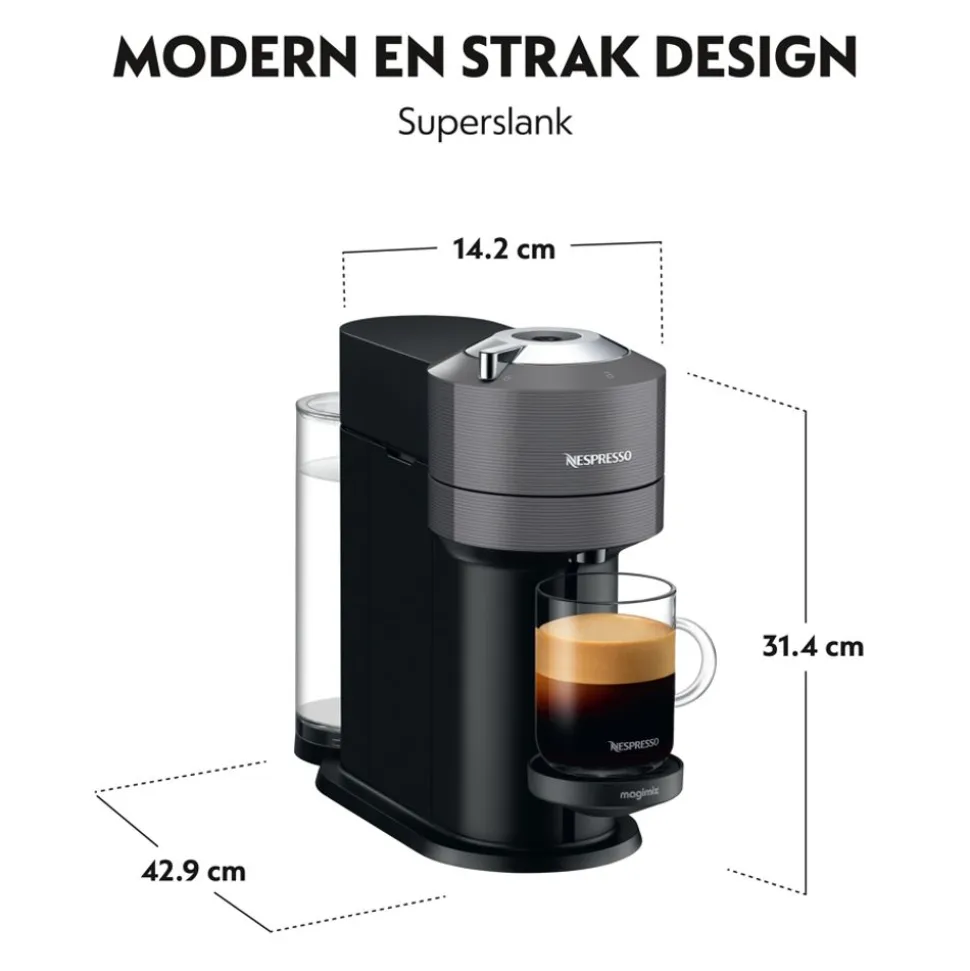 Nespresso Vertuo Next legt de lat voortdurend hoger. Zin in een grote kop koffie ’s ochtends? Een Espresso na de lunch? Of een Gran Lungo aan het eind van de middag? Het kan allemaal. De Vertuo Next machines van Nespresso zetten een stap in de toekomst met een nieuw bereidingssysteem, gebaseerd op Centrifusion-technologie. Met één druk op de knop herkent het intelligente systeem de koffiecapsule en gaat het aan de slag.