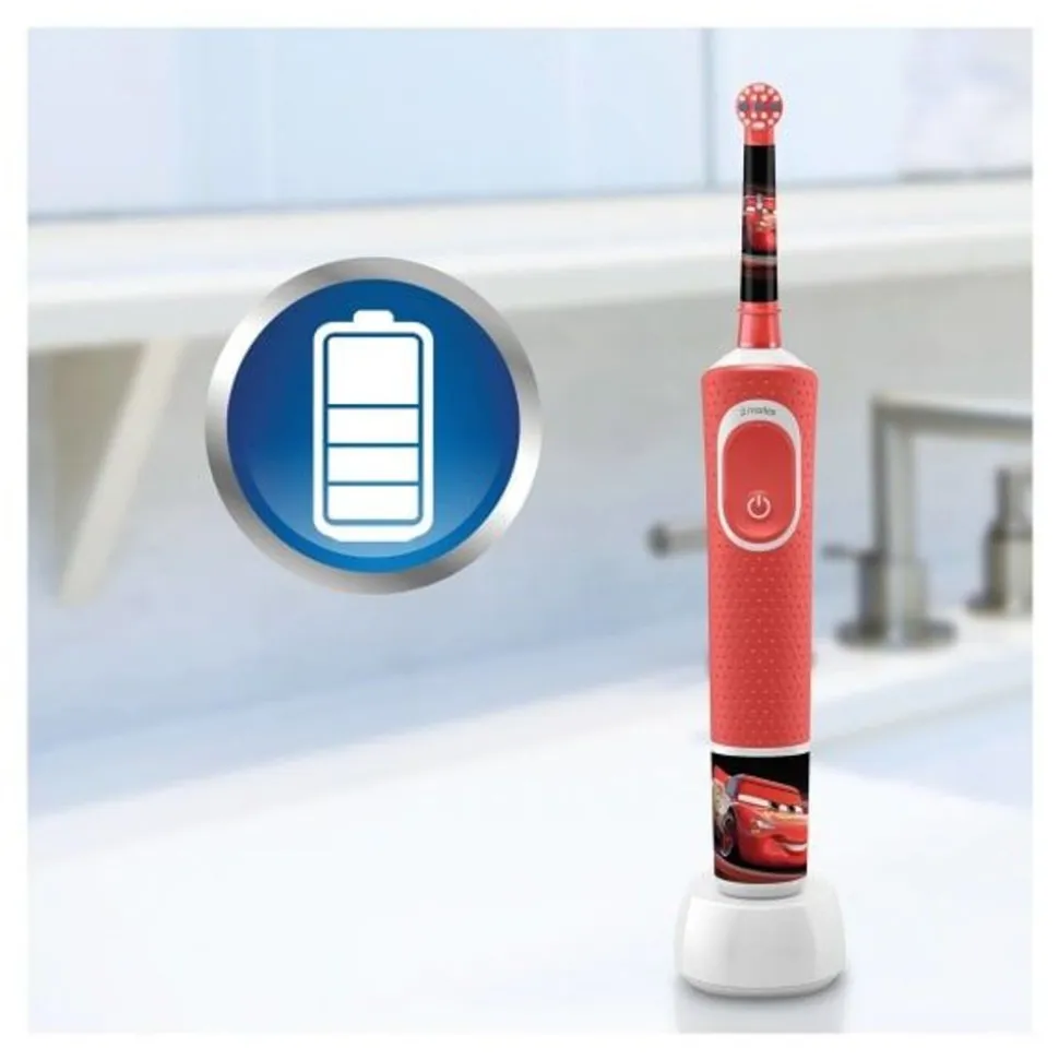 Met de Oral-B Kids elektrische tandenborstel voor kinderen vanaf 3 jaar kunnen kinderen plezier beleven aan Disney Pixar Cars én profiteren van de milde, effectieve reiniging van een door tandartsen aanbevolen tandenborstel van Oral-B. Met een unieke, kindvriendelijke gevoelige modus reinigt deze borstel de tanden van kinderen voorzichtig. Hij verwijdert meer tandplak dan een gewone manuele tandenborstel. Er zitten vier leuke Disney Pixar Cars-stickers bij om het handvat mooier te maken..