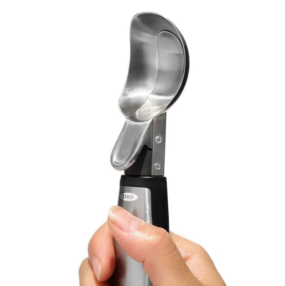De stevige en zware OXO RVS IJsschep schept zelfs het hardste ijs zonder moeite. Dankzij de iets gebogen kop maak je mooie ronde bollen. En met de pop-uphendel laat hij eenvoudig de ijsbol los. Klaar om de volgende bol te scheppen.
