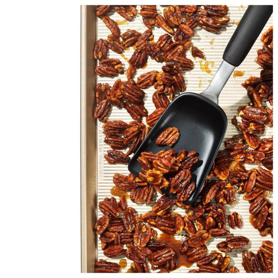 Of je nu een menigte te eten geeft of je klaarmaakt voor de komende week, maaltijden op bakplaten maken het koken een beetje gemakkelijker. Onze OXO Good Grips pannenschep is speciaal ontworpen om u te helpen uw maaltijden met minder rommel over te brengen. Een bredere schep schept meer groenten, vlees of vis op, terwijl de taps toelopende zijwanden voedsel helpen vasthouden tijdens het serveren of bewaren. De duurzame rand helpt bij het optillen van voedsel dat vastzit en maakt het gemakkelijk om overgebleven stukjes van bakplaten te schrapen. De veelzijdige Sheet Pan Scoop is gemaakt van hittebestendig nylon en is veilig voor gebruik met alle soorten kookgerei en vaatwasmachinebestendig.