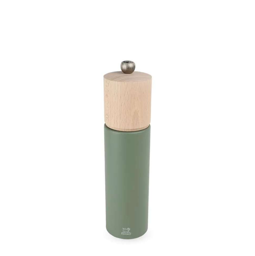 Deze pepermolen maakt indruk met zijn zachte, natuurlijke uitstraling. Het generfde hout en de groene kleur, die doet denken aan een schaduwrijk struikgewas bedekt met varens, geven de molen een zachte, frisse look, die wordt versterkt door het vloeiende, pretentieloze silhouet. De molen is voorzien van een stalen pepermechanisme met levenslange garantie. De maalgraad kan naar wens aangepast worden door de knop bovenop de molen vaster of losser te draaien.
