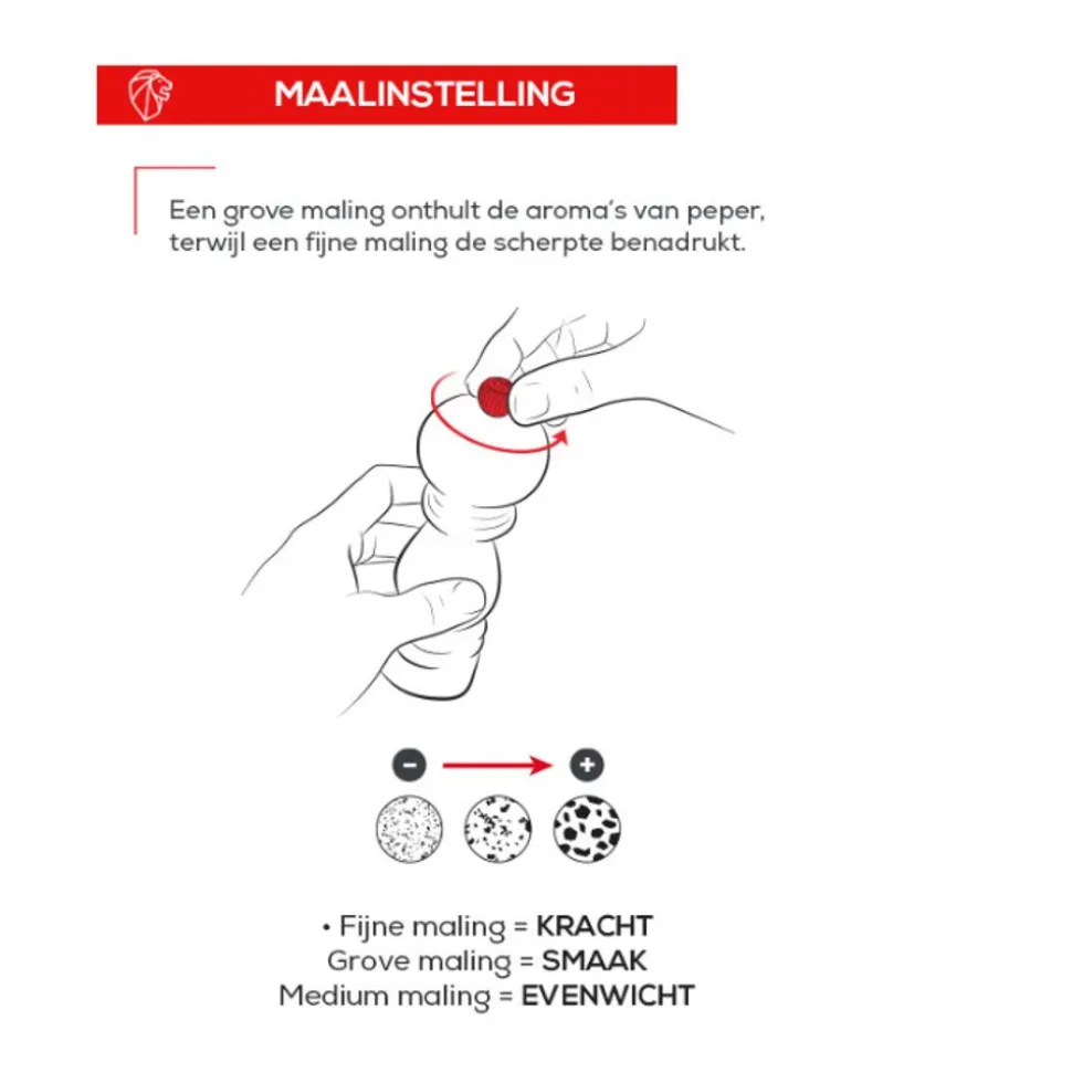 – Pepermolen: voor het malen van zwarte, witte, groene, rode en roze peper (max. 15% van de pepermelange) en korianderzaad
