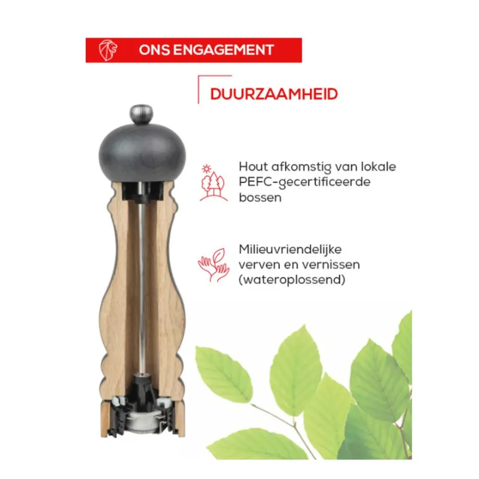 Geïnspireerd door de tinten van de natuur, roept deze Boréal Pepermolen in de kleur varengroen het plantaardige en de sereniteit van het bos op. Zijn strakke silhouet in beukenhout uit duurzaam beheerde bossen, verfraaid door een hydro oplosbare afwerking (watergedragen verf en lak), weerspiegelt een verantwoord engagement. Gemaakt in Frankrijk, is hij uitgerust met het Peugeot stalen mechanisme, erkend voor zijn prestaties en duurzaamheid, en gegarandeerd zonder tijdslimiet. Met een hoogte van 12 cm beschikt hij over een instelknop bovenaan om de maling aan te passen, van fijn tot grof naar wens. Gecombineerd met een lichtere zoutmolen uit de Boréal collectie vormt hij een natuurlijk, harmonieus en praktisch duo voor dagelijks gebruik aan tafel.
