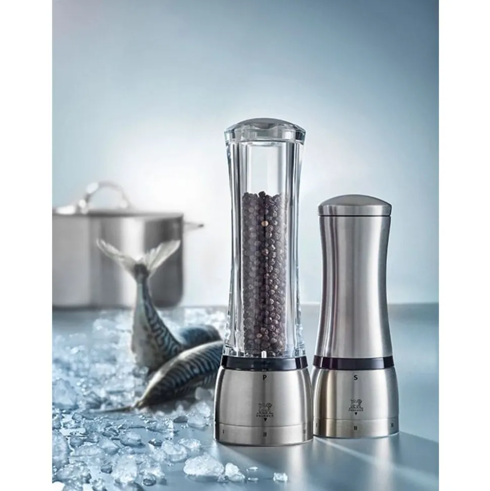 De Peugeot pepermolen Daman 21 cm combineert schoonheid en moderniteit. Met zijn sobere en strakke lijn, pleit Daman voor transparantie. Het ontbreken van de centrale as, een technisch hoogstandje, illustreert dit perfect: er is niets meer dat de transparantie en schoonheid van de inhoud komt verstoren. De magnetische vuldop van de molen zorgt voor makkelijk openmaken en bijvullen. Hij is uitgerust met het gepatenteerd U’Select-systeem voor een instelbare maalgraad van de peper. Zoals bij alle Peugeot molens, heeft zijn uiterst bestendig stalen maalwerk een onbeperkte garantie.