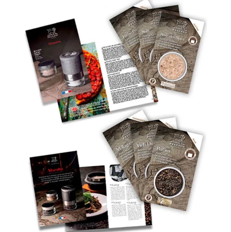 Om de ontdekking van smaken optimaal te beginnen, heeft Peugeot voor deze doos 3 uitzonderlijke pepers geselecteerd (een zwarte peper uit Brazilië, een vanille-witte peper uit Madagaskar en een wilde bes uit Vietnam met citrusaroma’s) en 3 zouten van verschillende oorsprong (Andes roze zout, gerookt zout uit Kroatië en een aromatische zoutmix – tomaten en gedroogde paprika’s, venkelzaad en tijm).