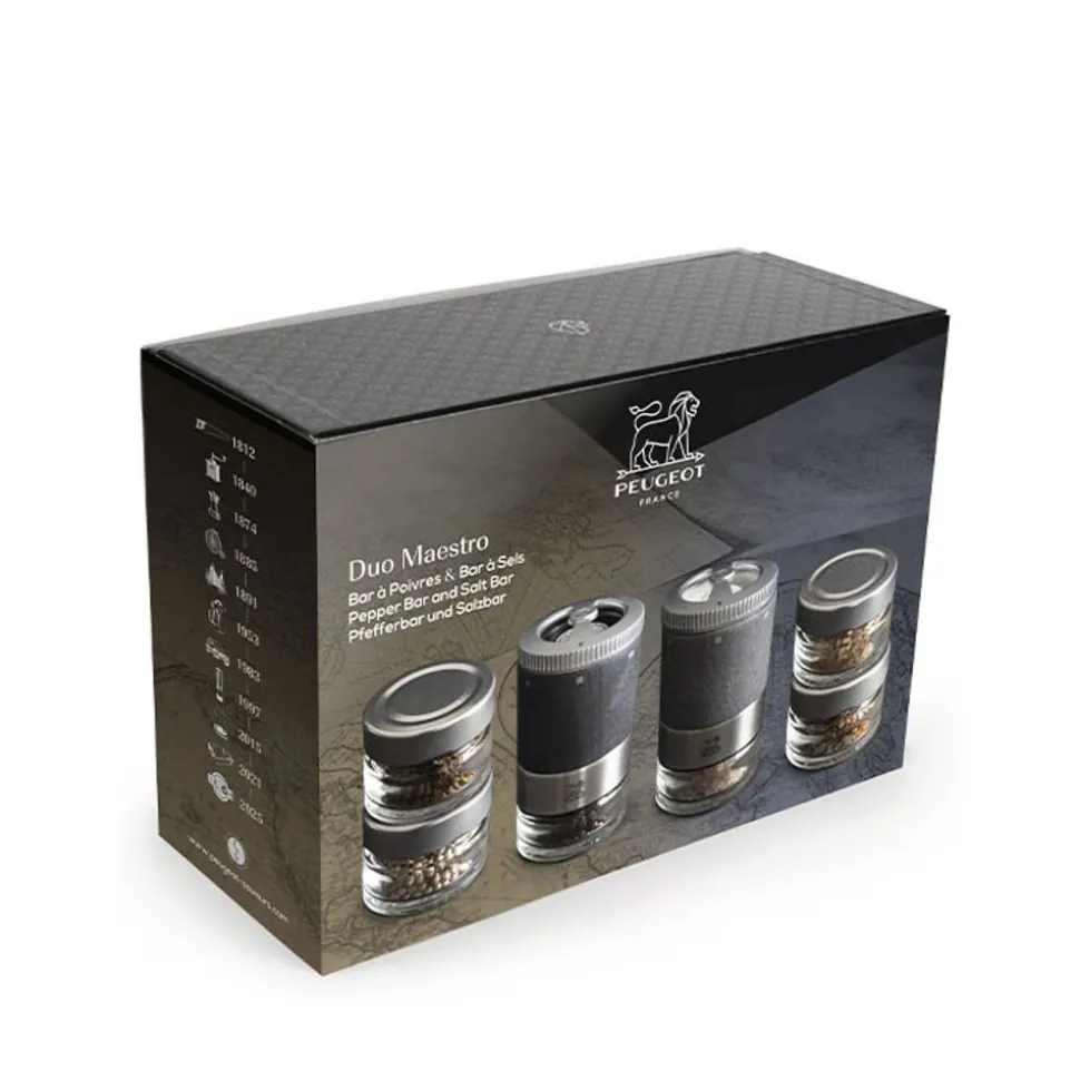 Voor dit onuitgegeven duo heeft Peugeot zijn peperbar en zijn zoutbar samengebracht, twee bijzonder ingenieuze molens met hun verwisselbare flacons waarmee u van de ene peper naar de andere of van het ene zout naar het andere kunt overstappen.