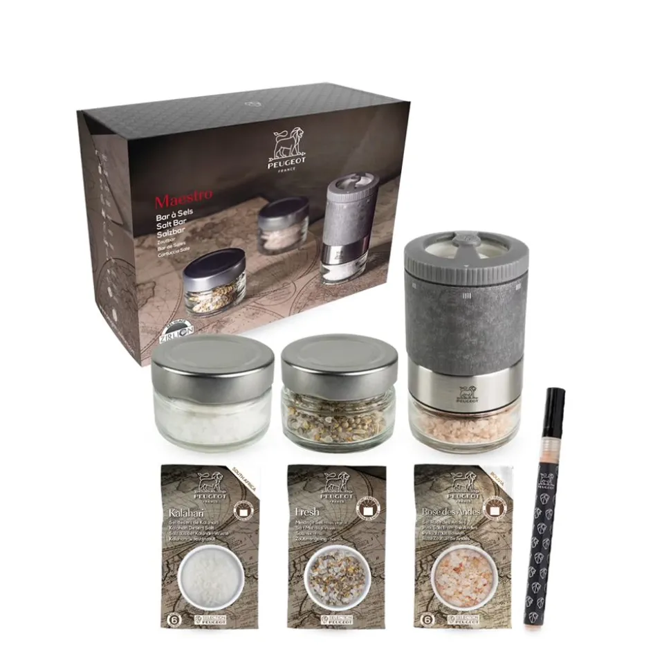 Het Maestro Zoutset, innovatief concept van de Zoutbar, vernieuwt de kunst van het kruiden. Met zijn verwisselbare reservoirs, die je eenvoudig kunt losschroeven, wisselt hij met één handeling van het ene zoutreservoir naar het andere. Uitgerust met het Zirconium mechanisme, een innovatie van Peugeot, en het precieze u’Select instelbare systeem, biedt het ook de mogelijkheid om te spelen met de texturen van zout en de maling af te stemmen op je wensen, van ijskoud zout, een extreem fijne maling, tot knapperig zout. Gemaakt in Frankrijk, combineert deze molen innovatie en praktischheid met zijn houten lichaam en glazen reservoir. Het wordt geleverd met 2 zouten van oorsprong, rijk aan mineralen en sporenelementen, en een aromatische mix die frisheid brengt, plus een adviesboekje en een uitwisbare stift.
